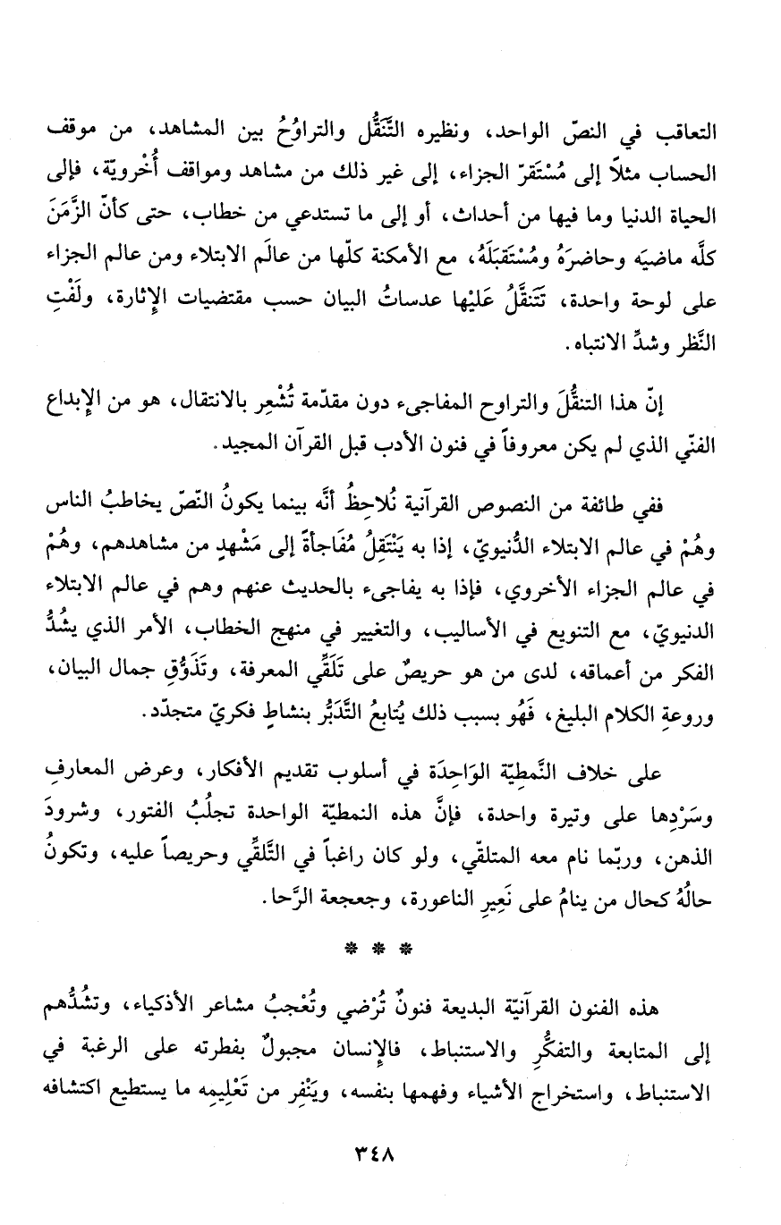 إنّ هذا التنقُّلَ والتراوح المفاجئ دون مقدّمة تُشْعِر الانتقال، هو من الإِبداع الفنّي الذي لم يكن معروفاً في فنون الأدب قبل القرآن المجيد.