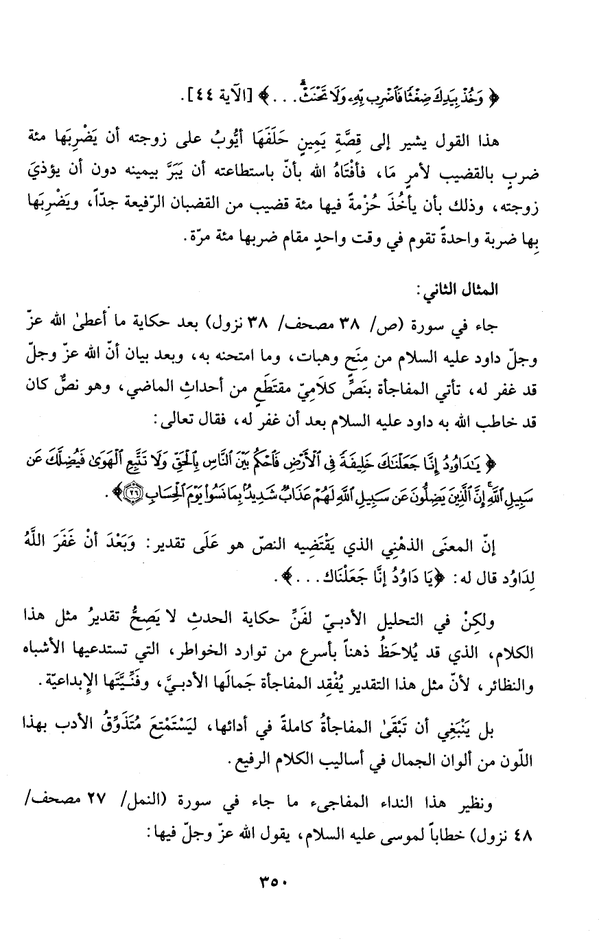 جاء في سورة (ص/ 38 مصحف /38 نزول) بعد حكاية ما أعطى الله عزّ وجلّ داود عليه السلام من مِنَحٍ وهبات، وما امتحنه به، وبعد بيان أنّ الله عزّ وجلّ قد غفر له، تأتي المفاجأة بنَصِّ كَلامِيّ مقتَطَعٍ من أحداثِ الماضي، وهو نصٌّ كان قد خاطب الله به داود عليه السلام بعد أن غفر له، فقال تعالى: