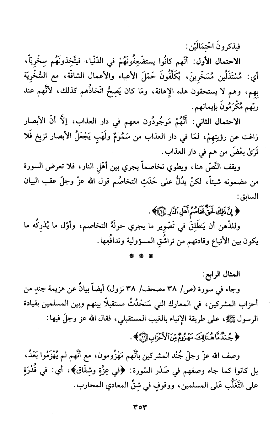 وجاء في سورة (ص/ 38 مصحف/ 38 نزول) أيضاً بيانٌ عن هزيمة جندٍ من أحزاب المشركين، في المعارك التي سَتحْدُثُ مستقبلاً بينهم وبين المسلمين بقيادة الرسول صَلَّى اللهُ عَلَيْهِ وَسَلَّمَ، على طريقة الإِنباء بالغيب المستقبلي، فقال الله عز وجلّ فيها: