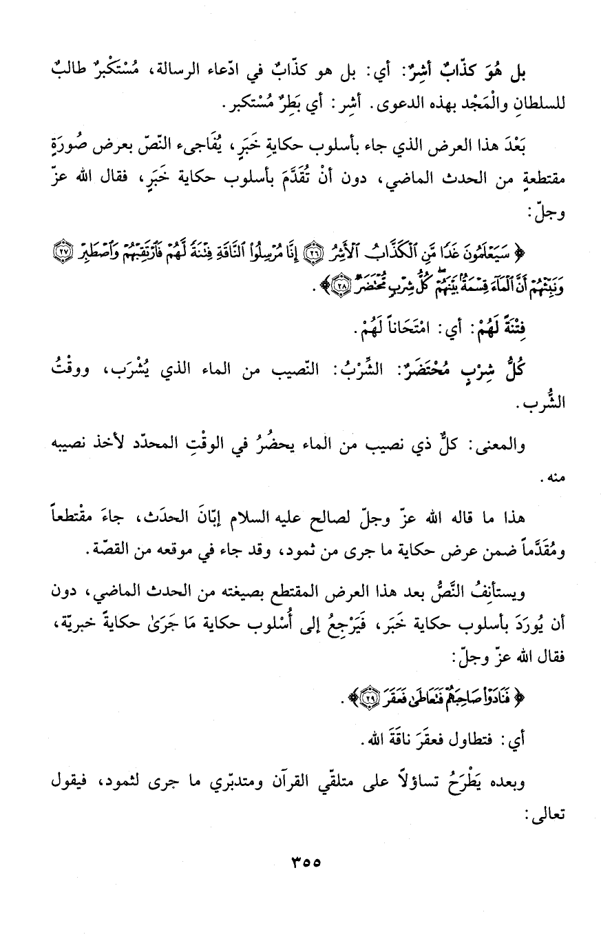 {سَيَعْلَمُونَ غَداً مَّنِ الكذاب الأشر * إِنَّا مُرْسِلُواْ الناقة فِتْنَةً لَّهُمْ فارتقبهم واصطبر * وَنَبِّئْهُمْ أَنَّ المآء قِسْمَةٌ بَيْنَهُمْ كُلُّ شِرْبٍ مُّحْتَضَرٌ} [الآيات: 26 - 28] .