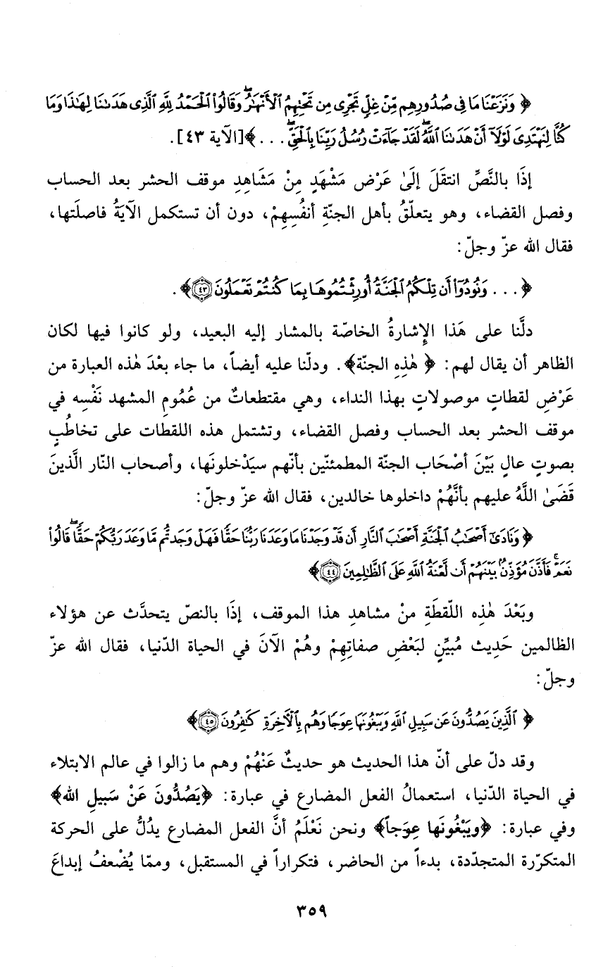 وقد دلّ على أنّ هذا الحديث هو حديثٌ عَنْهُمْ وهم ما زالوا في عالم الابتلاء في الحياة الدّنيا، استعمالُ الفعل المضارع في عبارة: {يَصُدُّونَ عَن سَبِيلِ الله} وفي عبارة: {وَيَبْغُونَهَا عِوَجاً} ونحن نَعْلَمُ أنَّ الفعل المضارع يدُلُّ على الحركة المتكرّرة المتجدّدة، بدءاً من الحاضر، فتكراراً في المستقبل، وممّا يُضْعفُ إبداعَ