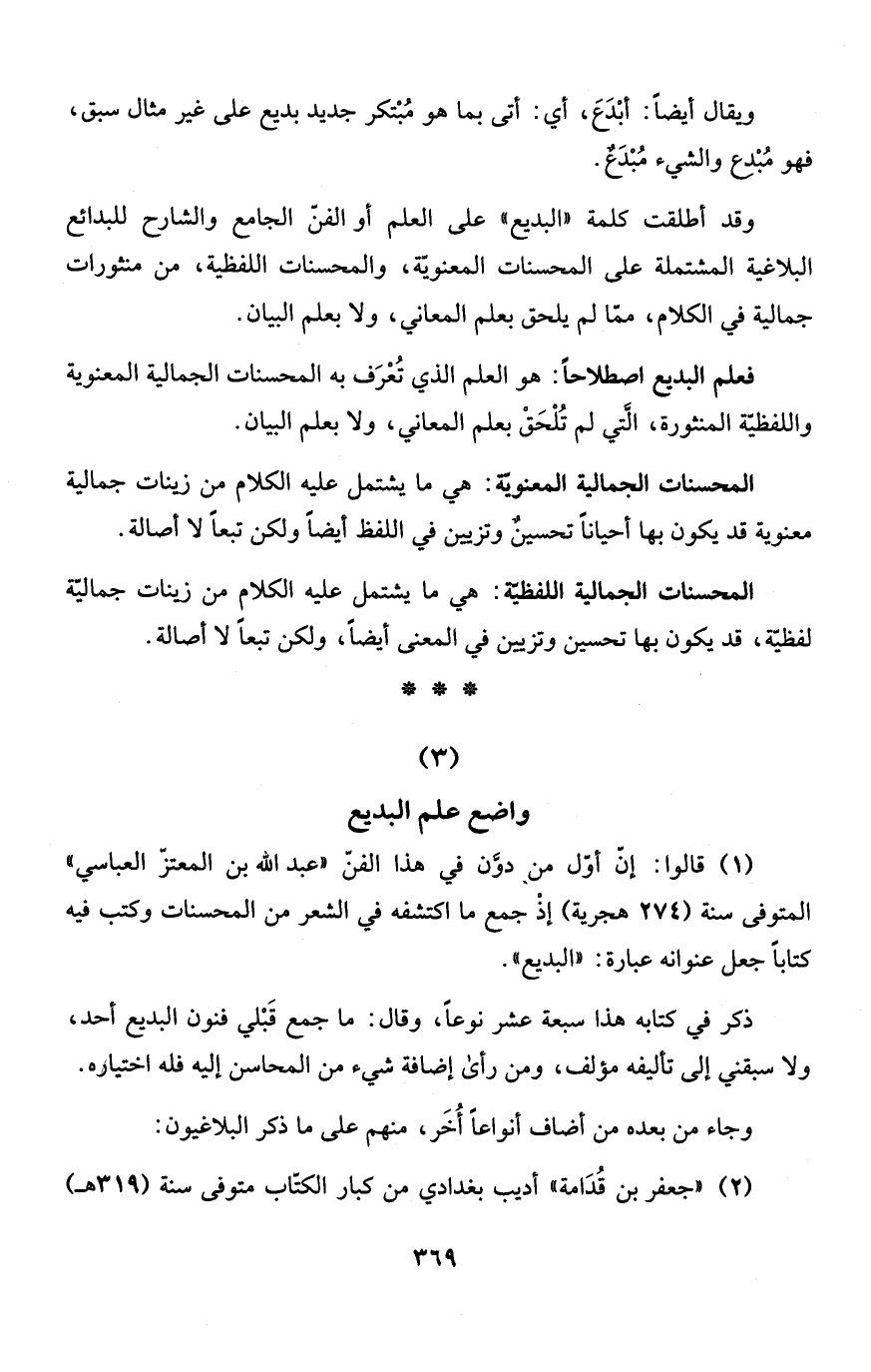 (1) قالوا: إنّ أوّل من دوَّن في هذا الفنّ "عبد الله بن المعتزّ العباسي" المتوفى سنة (274 هجرية) إذْ جمع ما اكتشفه في الشعر من المحسنات وكتب فيه كتاباً جعل عنوانه عبارة: "البديع".
