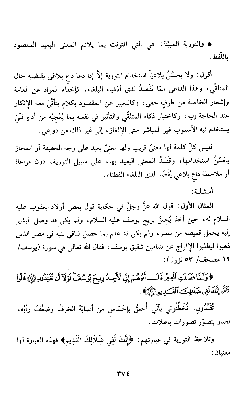 وتلاحظ التورية في عبارتهم: {إِنَّكَ لَفِي ضَلاَلِكَ القديم} فهذه العبارة لها معنيان: