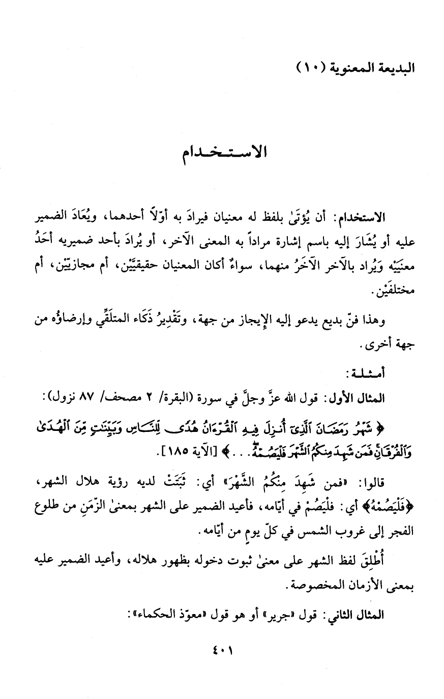 الاستخدام: أن يُؤتَى بلفظ له معنيان فيرادَ به أوّلاً أحدهما، ويُعَادَ الضمير عليه أو يُشَارَ إليه باسم إشارة مراداً به المعنى الآخر، أو يُرادَ بأحد ضميريه أحَدُ معنَيَيْه وَيُراد بالآخر الآخَرُ منهما، سواءٌ أكان المعنيان حقيقيَّيْن، أم مجازيّيْن، أم مختلفَيْن.