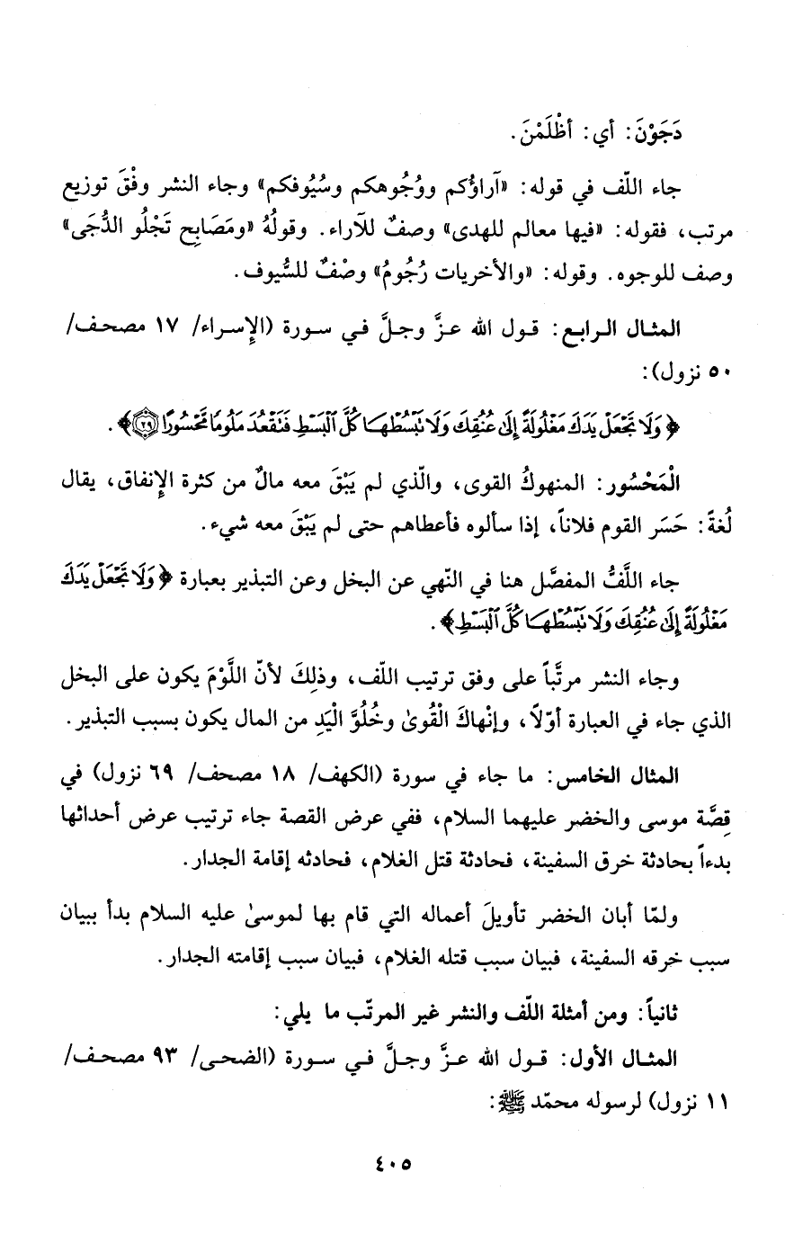 جاء اللَّفُّ المفصَّل هنا في النّهي عن البخل وعن التبذير بعبارة {وَلاَ تَجْعَلْ يَدَكَ مَغْلُولَةً إلى عُنُقِكَ وَلاَ تَبْسُطْهَا كُلَّ البسط} .