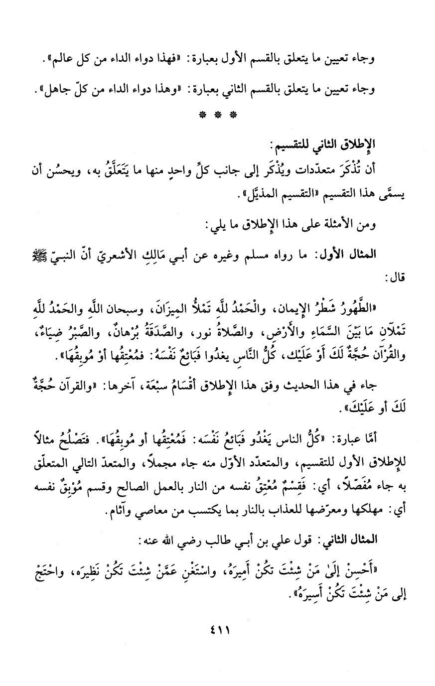 المثال الأول: ما رواه مسلم وغيره عن أبي مَالِكِ الأشعريّ أنّ النبيّ صَلَّى اللهُ عَلَيْهِ وَسَلَّمَ قال: