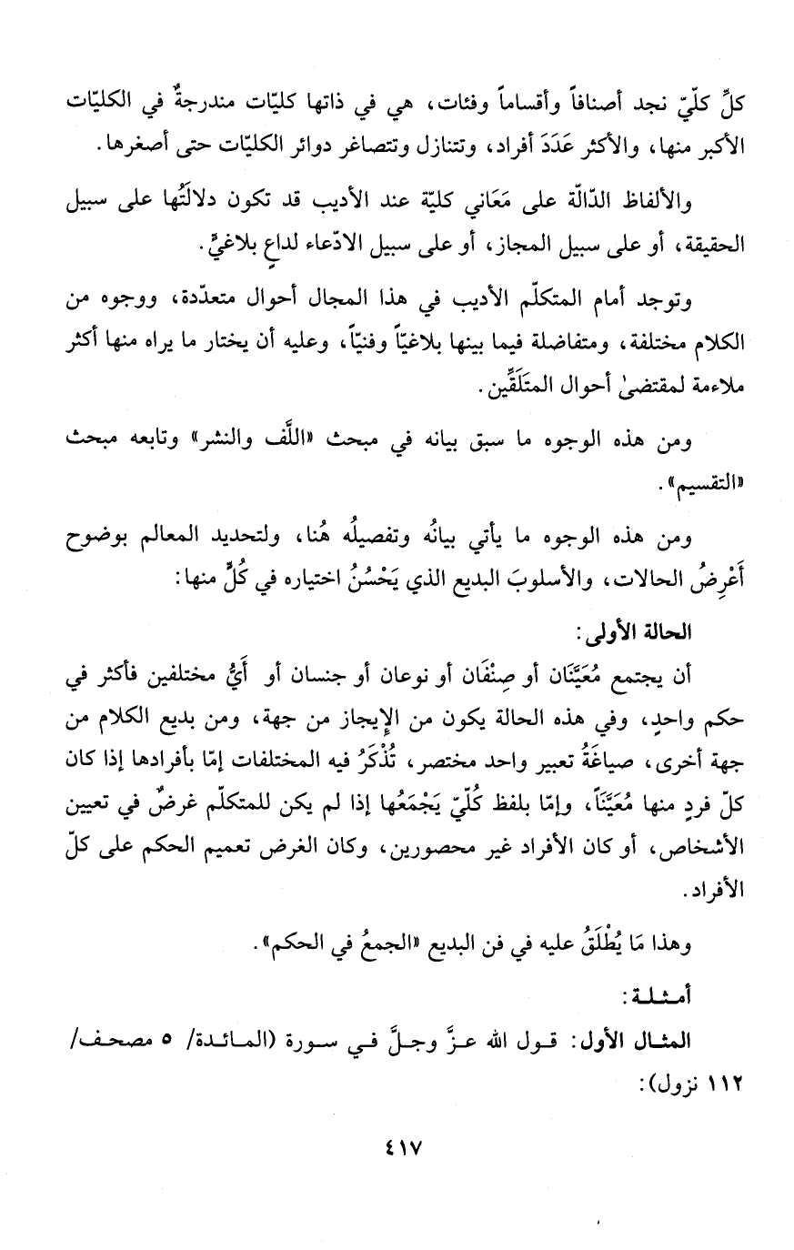 أن يجتمع مُعَيَّنَان أو صِنْفَان أو نوعان أو جنسان أو أَيُّ مختلفين فأكثر في حكم واحدٍ، وفي هذه الحالة يكون من الإِيجاز من جهة، ومن بديع الكلام من جهة أخرى، صياغَةُ تعبير واحد مختصر، تُذْكَرُ فيه المختلفات إمّا بأفرادها إذا كان كلّ فردٍ منها مُعَيَّنَاً، وإمّا بلفظ كُلّيّ يَجْمَعُها إذا لم يكن للمتكلّم غرضٌ في تعيين الأشخاص، أو كان الأفراد غير محصورين، وكان الغرض تعميم الحكم على كلّ الأفراد.