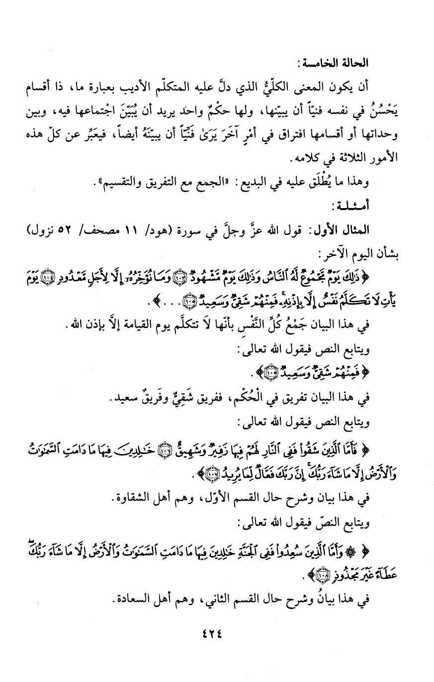أن يكون المعنى الكلّيُّ الذي دلَّ عليه المتكلّم الأديب بعبارة ما، ذا أقسام يَحْسُنُ في نفسه فنيّاً أن يبيّنها، ولها حكْمٌ واحد يريد أن يُبَيّنَ اجْتماعها فيه، وبين وحداتها أو أقسامها افتراق في أمْرٍ آخَرَ يَرَى فَنِّيّاً أن يبيّنَهُ أيضاً، فيعَبِّر عن كلّ هذه الأمور الثلاثة في كلامه.