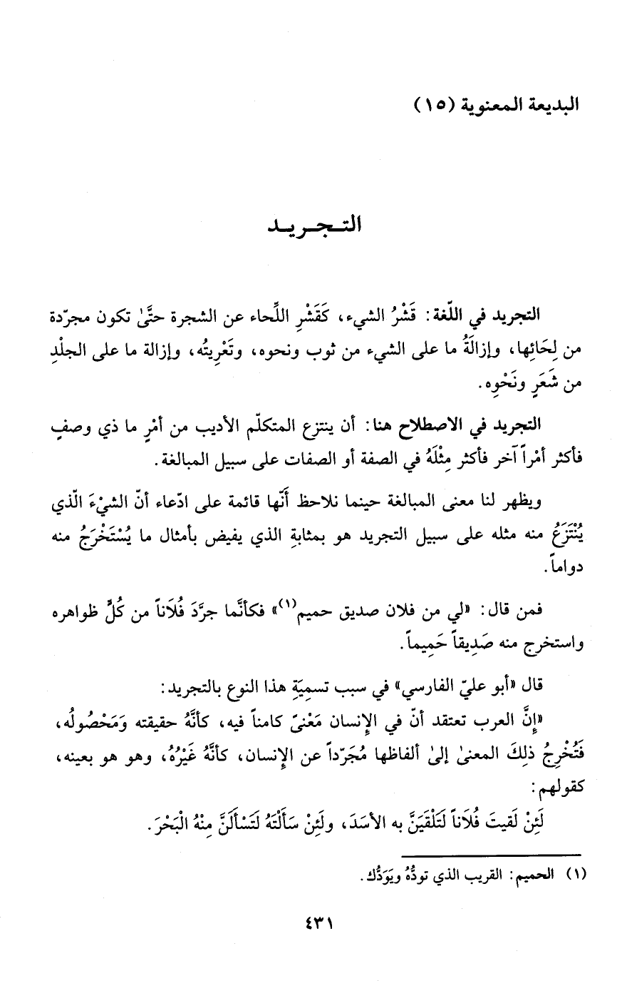 فمن قال: "لي من فلان صديق حميم" فكأنَّما جرَّدَ فُلاَناً من كُلٍّ ظواهره واستخرج منه صَدِيقاً حَمِيماً.
