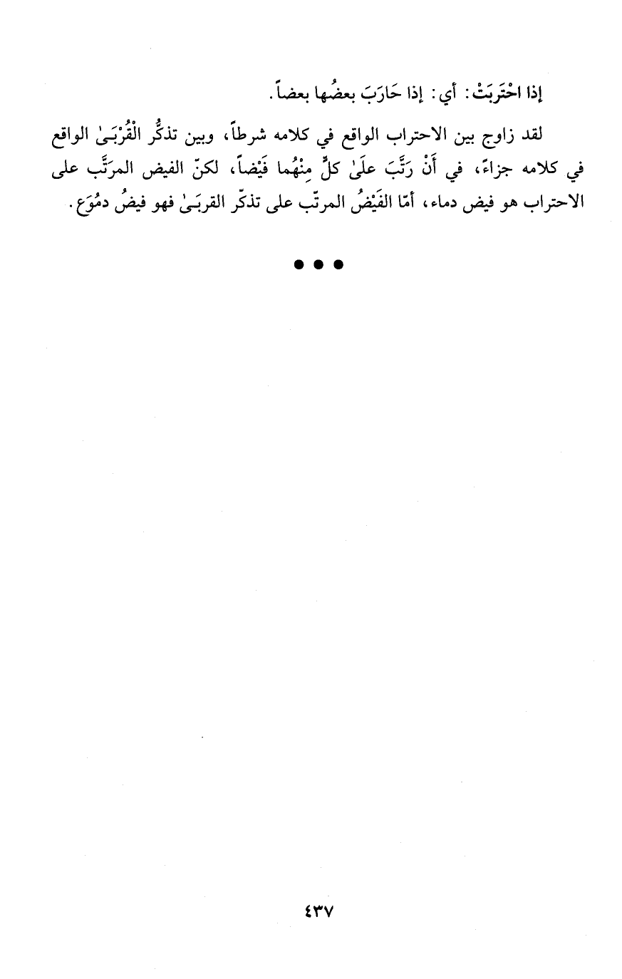لقد زاوج بين الاحتراب الواقع في كلامه شرطاً، وبين تذكُّر الْقُرْبَى الواقع في كلامه جزاءً، في أَنْ رَتَّبَ علَى كلٍّ مِنْهُما فَيْضاً، لكنّ الفيض المرَتَّب على الاحتراب هو فيض دماء، أمّا الفَيْضُ المرتّب على تذكّر القربَى فهو فيضُ دمُوَع.