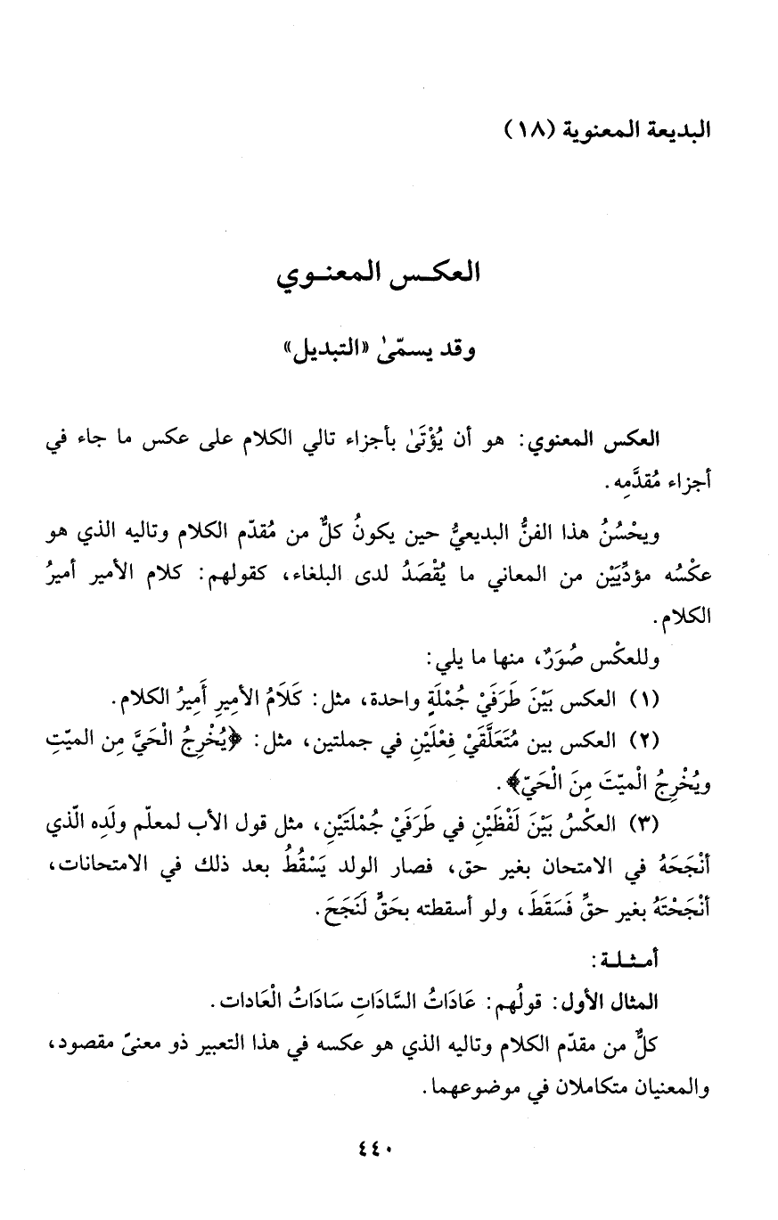 (1) العكس بَيْنَ طَرَفَيْ جُمْلَةٍ واحدة، مثل: كَلاَمُ الأمِيرِ أَمِيرُ الكلام.