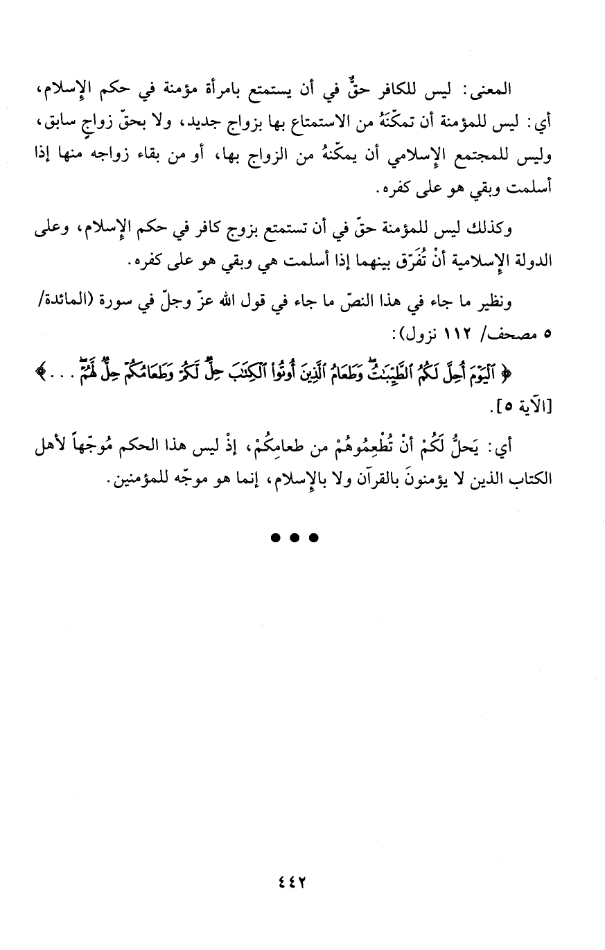 وكذلك ليس للمؤمنة حقّ في أن تستمتع بزوج كافر في حكم الإِسلام، وعلى الدولة الإِسلامية أنْ تُفَرّق بينهما إذا أسلمت هي وبقي هو على كفره.
