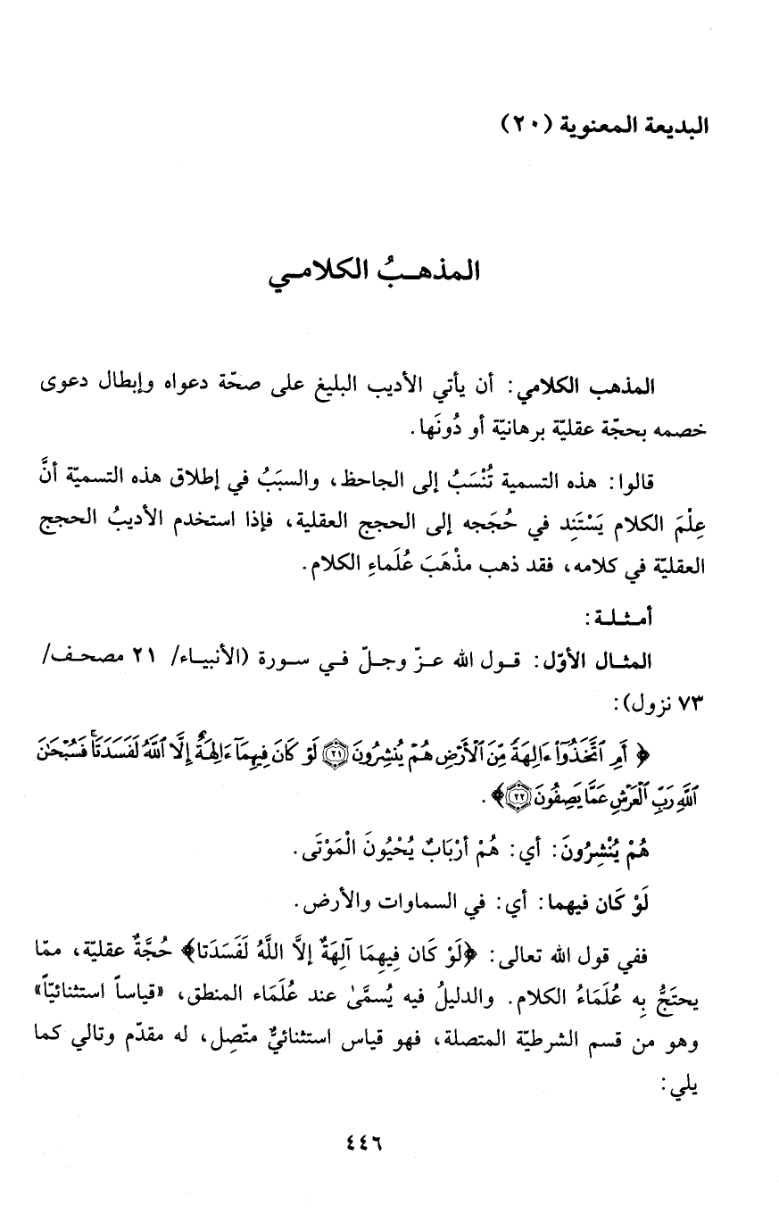 ففي قول الله تعالى: {لَوْ كَانَ فِيهِمَآ آلِهَةٌ إِلاَّ الله لَفَسَدَتَا} حُجَّةٌ عقليّة، ممّا يحتَّجُّ بِه عُلَمَاءُ الكلام. والدليلُ فيه يُسمَّى عند عُلَمَاء المنطق، "قياساً استثنائيّاً" وهو من قسم الشرطيّة المتصلة، فهو قياس استثنائيٌّ متّصِل، له مقدّم وتالي كما يلي: