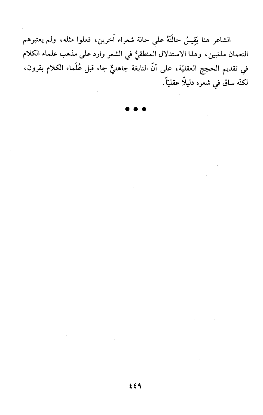 الشاعر هنا يَقِيسُ حالَتَهُ على حالة شعراء آخرين، فعلوا مثله، ولم يعتبرهم النعمان مذنبين، وهذا الاستدلال المنطقيُّ في الشعر وارد على مذهب علماء الكلام في تقديم الحجج العقليّة، على أنّ النابغة جاهليٌّ جاء قبل عُلَماء الكلام بقرون، لكنّه ساق في شعره دليلاً عقليّاً.