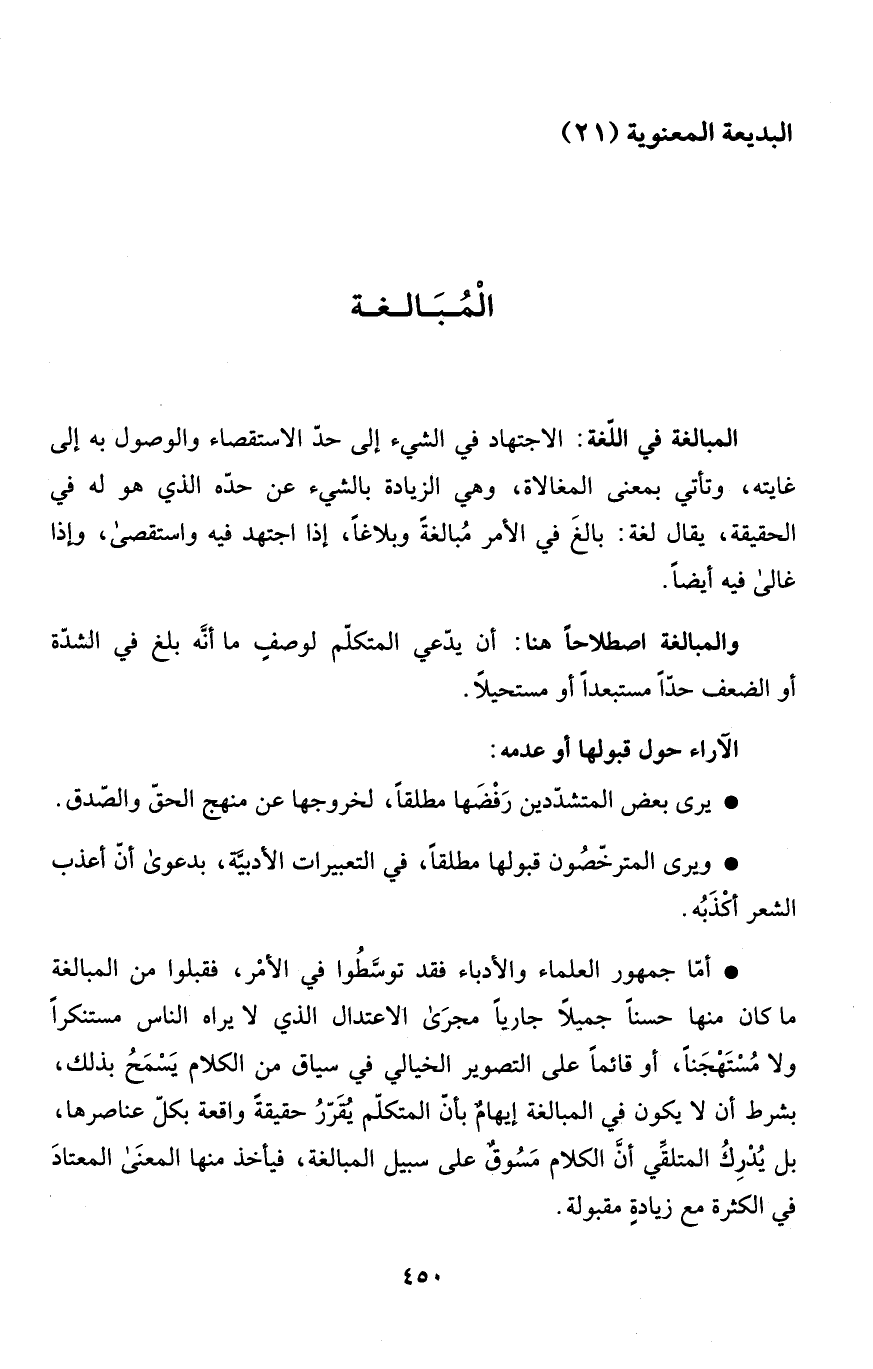 والمبالغة اصطلاحاً هنا: أن يدّعي المتكلّم لوصفٍ ما أنَّه بلغ في الشدّة أو الضعف حدّاً مستبعداً أو مستحيلاً.