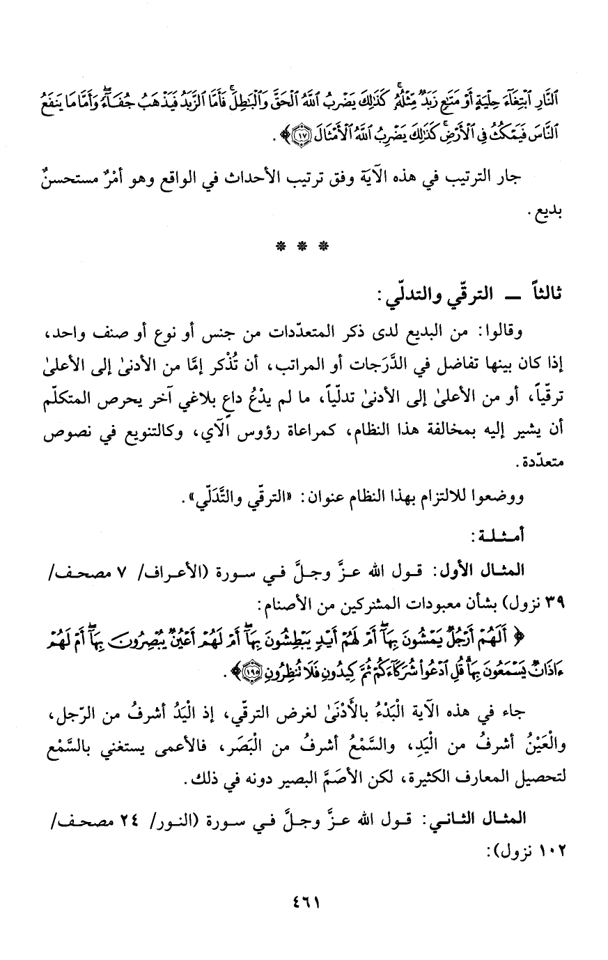 وقالوا: من البديع لدى ذكر المتعدّدات من جنس أو نوع أو صنف واحد، إذا كان بينها تفاضل في الدَّرَجات أو المراتب، أن تُذْكر إمَّا من الأدنى إلى الأعلى ترقّياً، أو من الأعلى إلى الأدنى تدلّياً، ما لم يدْعُ داعٍ بلاغي آخر يحرص المتكلّم أن يشير إليه بمخالفة هذا النظام، كمراعاة رؤوس الآي، وكالتنويع في نصوص متعدّدة.