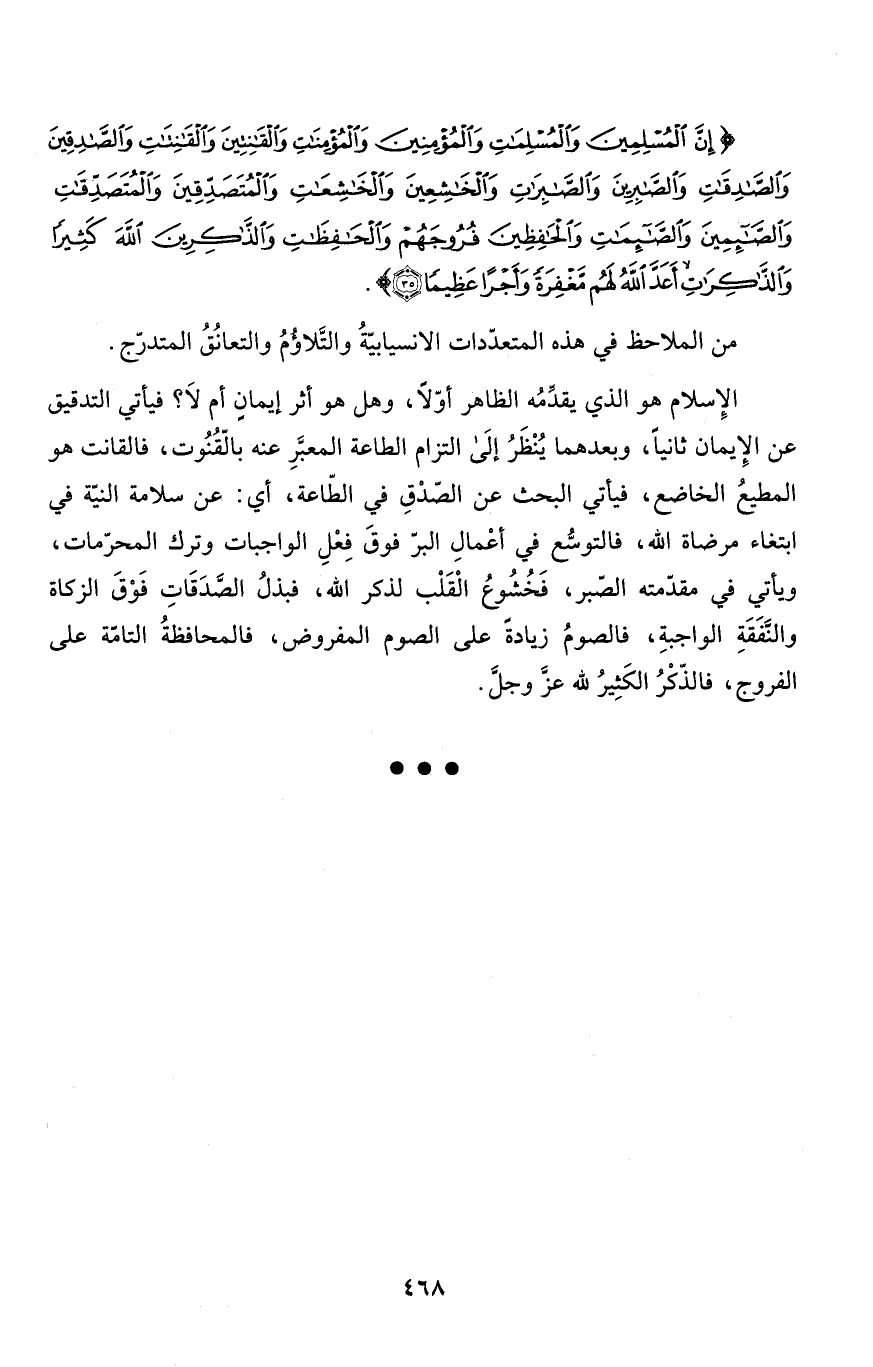 الإِسلام هو يقدِّمُه الظاهر أوّلاً، وهل هو أثر إيمانٍ أم لاَ؟ فيأتي التدقيق عن الإِيمان ثانياً، وبعدهما يُنْظَرُ إلَى التزام الطاعة المعبَّرِ عنه بالّقُنُوت، فالقانت هو المطيعُ الخاضع، فيأتي البحث عن الصّدْقِ في الطَّاعة، أي: عن سلامة النيّة في ابتغاء مرضاة الله، فالتوسُّع في أعْمالِ البرّ فوقَ فِعْلِ الواجبات وترك المحرّمات، ويأتي في مقدّمته الصّبر، فَخُشُوعُ الْقَلْب لذكر الله، فبذلُ الصَّدَقَاتِ فَوْقَ الزكاة والنَّفَقَةِ الواجبةِ، فالصومُ زيادةً على الصوم المفروض، فالمحافظةُ التامّة على الفروج، فالذّكْرُ الكَثِيرُ لله عزَّ وجلَّ.