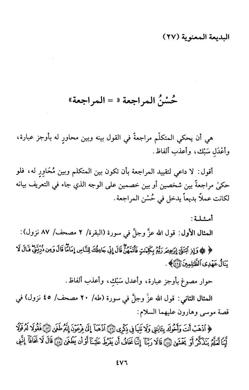أقول: لا داعي لتقييد المراجعة بأن تكون بين المتكلم وبين مُحَاوِرٍ له، فلو حكى مراجعةً بين شخصين أو بين خصمين على الوجه الذي جاء في التعريف بيانه لكانت عملاً بديعاً يدخل في حُسْن المراجعة.