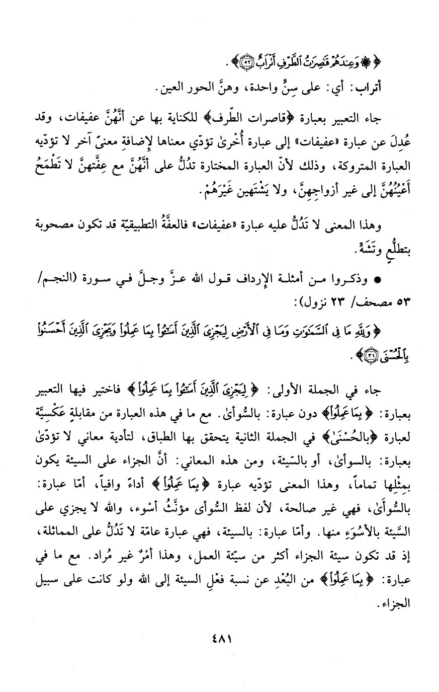 جاء في الجملة الأولى: {لِيَجْزِيَ الذين أَسَاءُواْ بِمَا عَمِلُواْ} فاختير فيها التعبير بعبارة: {بِمَا عَمِلُواْ} دون عبارة: بالسُّوأى. مع ما في هذه العبارة من مقابلةٍ عَكْسِيَّة لعبارة {بالحسن} في الجملة الثانية يتحقق بها الطباق، لتأدية معاني لا تؤدّى بعبارة: بالسوأى، أو بالسّيئة، ومن هذه المعاني: أنَّ الجزاء على السيئة يكون بمِثْلِها تماماً، وهذا المعنى تؤدّيه عبارة {بِمَا عَمِلُواْ} أداءً وافياً، أمّا عبارة: بالسُّوأَى، فهي غير صالحة، لأن لفظ السُّوأى مؤنَّثُ أسْوء، والله لا يجزي على السَّيئة بالأسُوَءِ منها. وأمّا عبارة: بالسيئة، فهي عبارة عامّة لا تَدُلُّ على المماثلة، إذ قد تكون سيئة الجزاء أكثر من سيّئة العمل، وهذا أمْرٌ غير مُراد. مع ما في عبارة: {بِمَا عَمِلُواْ} من البُعْدِ عن نسبة فعْلِ السيئة إلى الله ولو كانت على سبيل الجزاء.