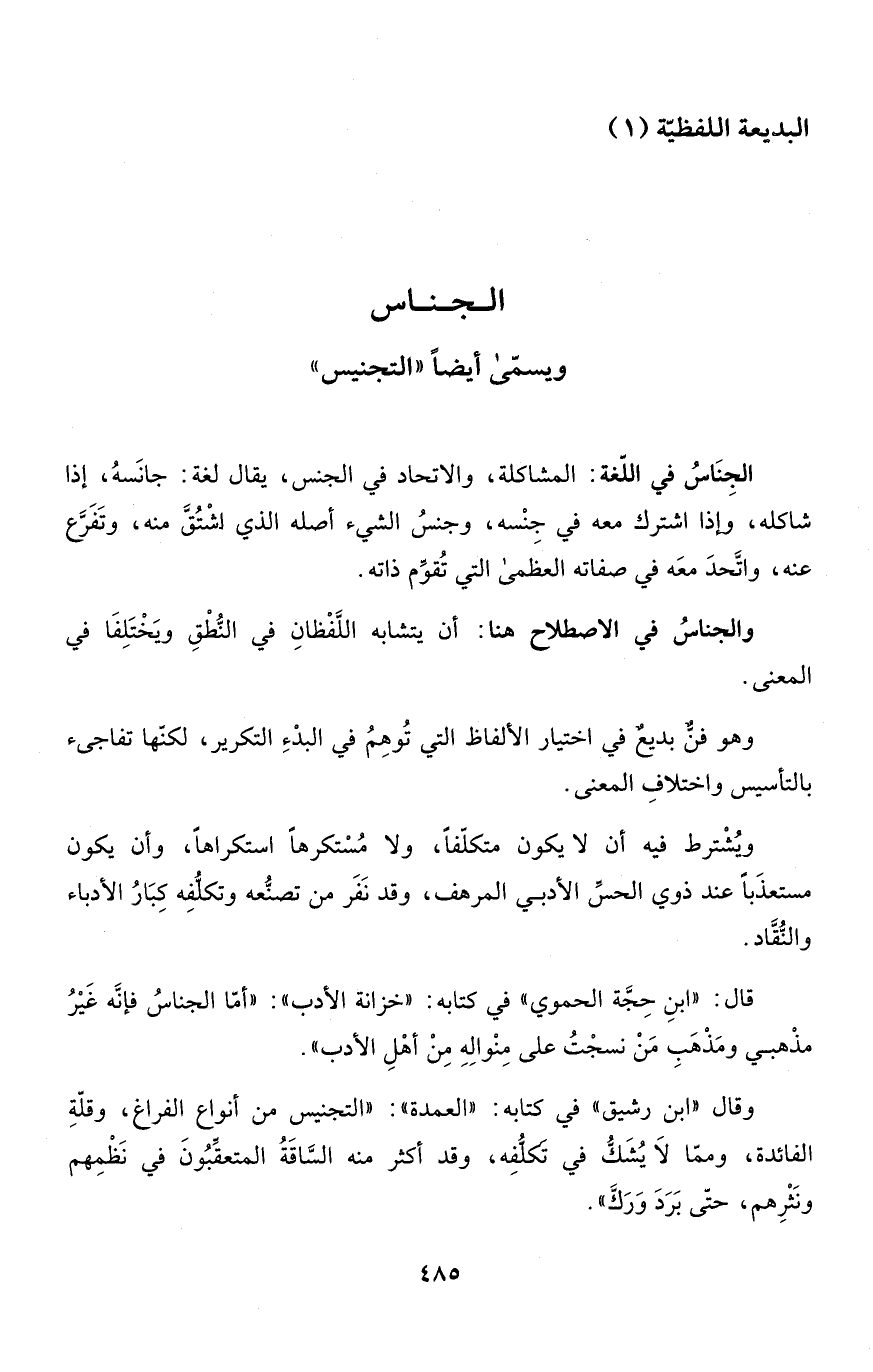 قال: "ابنِ حِجَّة الحموي" في كتابه: "خزانة الأدب": "أمّا الجناسُ فإنَّه غَيْرُ مذْهبي ومَذْهَبِ مَنْ نسجْتُ على مِنْوالِهِ مِنْ أهْلِ الأدب".