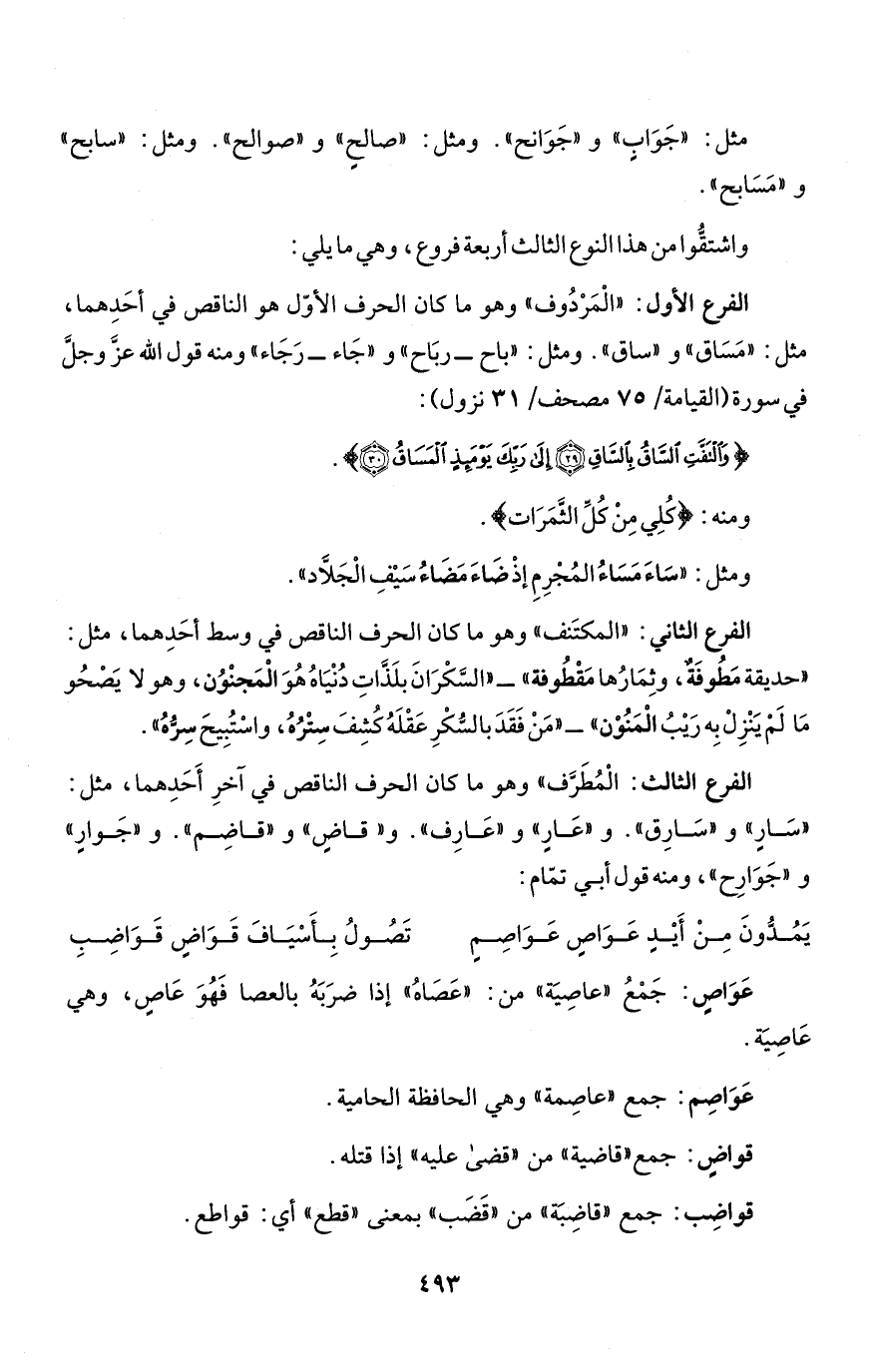 الفرع الأول: "الْمَرْدُوف" وهو ما كان الحرف الأوّل هو الناقص في أحَدِهما، مثل: "مَسَاق" و"ساق". ومثل: "باح - ربَاح" و"جَاء - رَجَاء" ومنه قول الله عزَّ وجلَّ في سورة (القيامة/ 75 مصحف/ 31 نزول) :