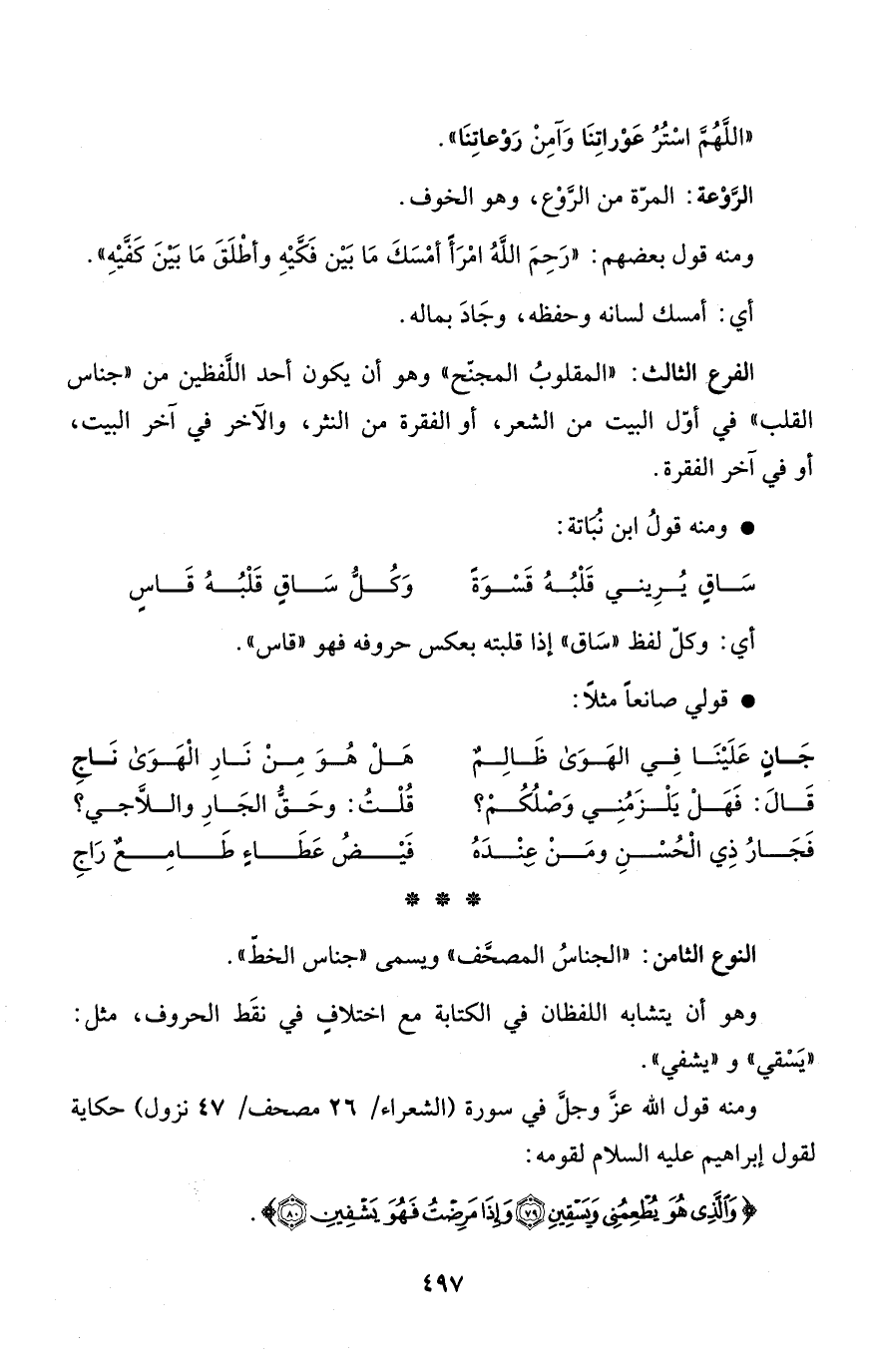 الفرع الثالث: "المقلوبُ المجنّح" وهو أن يكون أحد اللَّفظين من "جناس القلب" في أوّل البيت من الشعر، أو الفقرة من النثر، والآخر في آخر البيت، أو في آخر الفقرة.