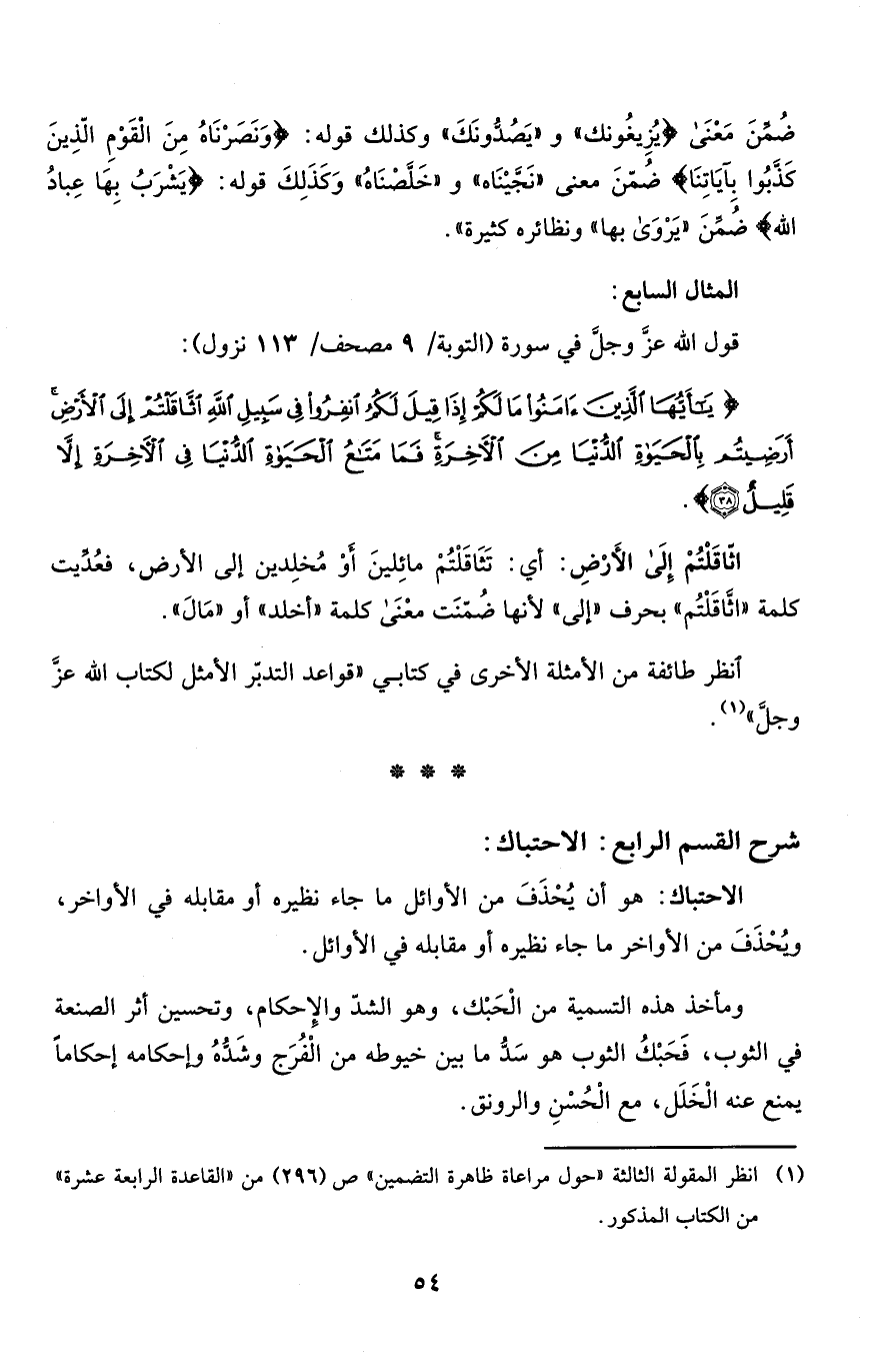 الاحتباك: هو أن يُحْذَفَ من الأوائل ما جاء نظيره أو مقابلة في الأواخر، ويُحْذَفَ من الأواخر ما جاء نظيره أو مقابلة في الأوائل.