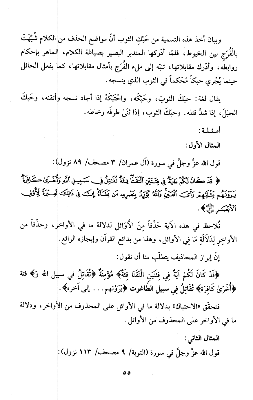 وبيان أخذ هذه التسمية من حَبْكِ الثوب أنّ مواضع الحذف من الكلام شُبِّهَتْ بالْفُرَجِ بين الخيوط، فلمّا أدْركها المتدبر البصير بصياغة الكلام، الماهر بإحكام روابطه، وأدْرك مقابلاتها، تنبّه إلى ملء الفُرَج بأمثال مقابلاتها، كما يفعل الحائل حينما يُجْري حبكاً مُحْكماً في الثوب الذي ينسجه.