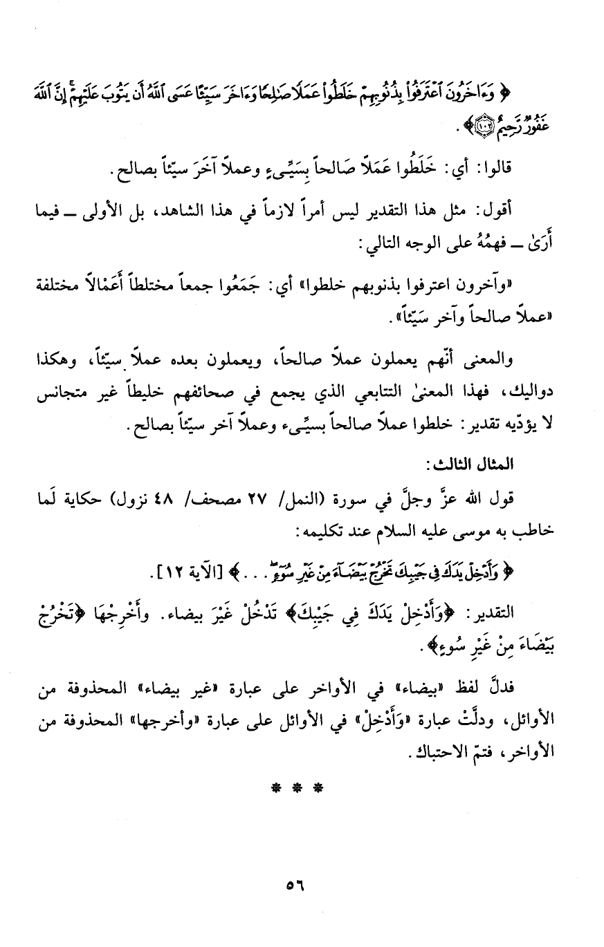 فدلَّ لفظ "بيضاء" في الأواخر على عبارة "غير بيضاء" المحذوفة من الأوائل، ودلَّتْ عبارة "وَأَدْخِلْ" في الأوائل على عبارة "وأخرجها" المحذوفة من الأواخر، فتمّ الاحتباك.