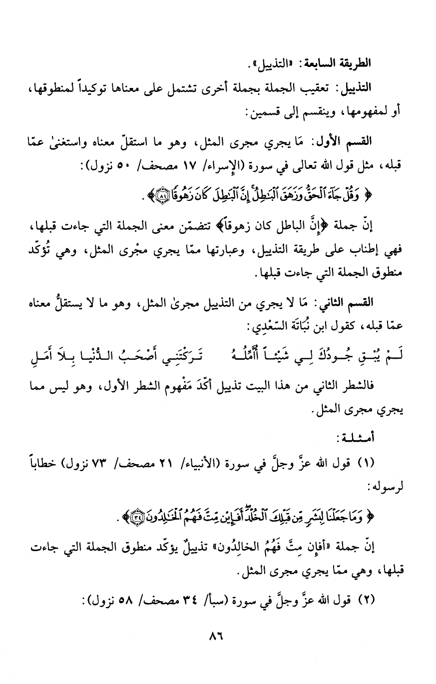 القسم الثاني: مَا لا يجري من التذييل مجرى المثل، وهو ما لا يستقلُّ معناه عمّا قبله، كقول ابن نُبَاتَة السّعْدِي: