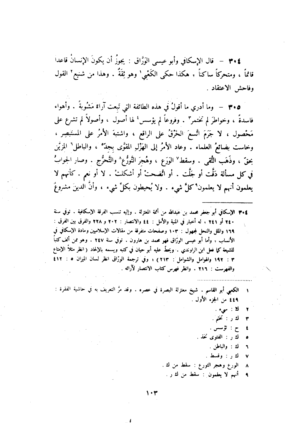 قال الإسكافي وأبو عيسى الوراق: يجوز أن يكون الإنسان قاعدا قائماً، ومتحركاً ساكناً؛ هكذا حكى الكعبي وهو ثقة، وهذا من شنيع القول وفاحش الأعتقاد.