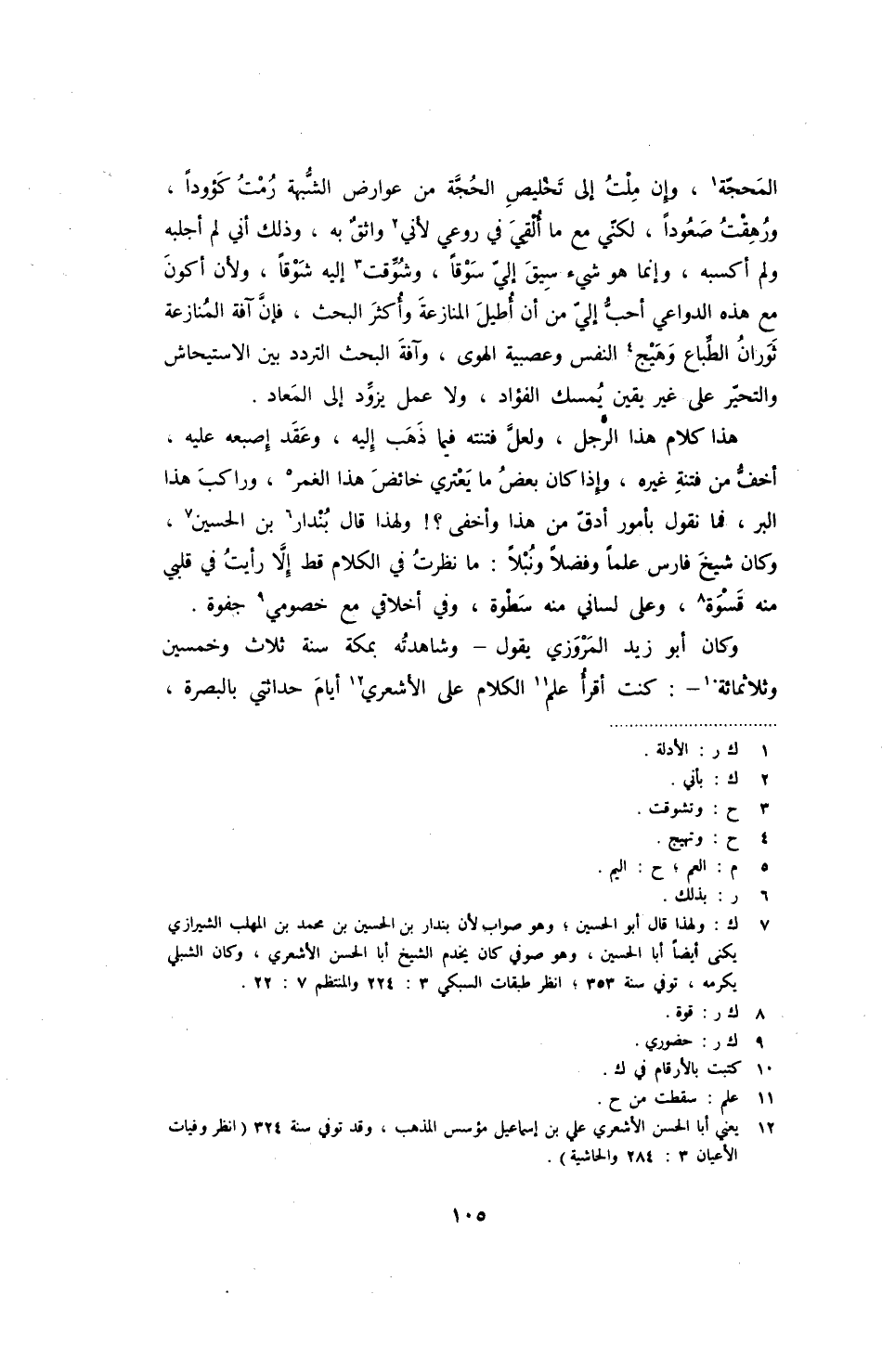 هذا كلام هذا الرجل، ولعل فتنته فيما ذهب إليه، وعقد إصبعه عليه، أخف من فتنة غيره، وإذا كان بعض ما يعتري خائض هذا العمر، وراكب هذا البر، فما نقول بأمور أدق من هذا وأخفى؟! ولهذا قال بندار بن الحسين، وكان شيخ فارس علماً وفضلاً ونبلاً: ما نظرت في الكلام قط إلا رأيت في قلبي منه قسوة، وعلى لساني منه سطوة، وفي أخلاقي مع خصومي جفوة.