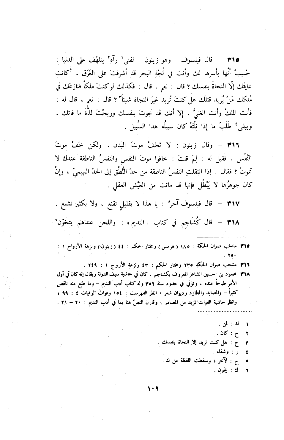 قال فيلسوف - وهو زينون - لفتى رآه يتلهف على الدنيا: أحسب أنها بأسرها لك وأنت في لجة البحر قد أشرفت على الغرق، أكانت غايتك إلا النجاة بنفسك؟ قال: نعم، قال: فكذلك لو كنت ملكاً فنازعك في ملكك من يريد قتلك هل كنت تريد غير النجاة شيئاً؟ قال: نعم، قال له: فأنت الملك وأنت الغني، إلا أنك قد نجوت بنفسك وربحت لذة ما فاتك، ويبقى طلب ما إذا نلته كان سبيله هذا السبيل.