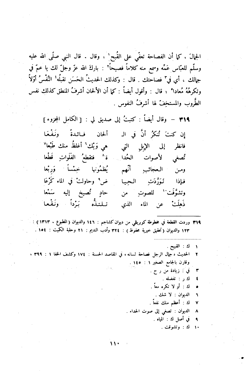 الجمال، كما أن الفصاحة تعفي على القبح؛ وقال، قال النبي صلى الله عليه وسلم للعباس عمه وسمع منه كلاماً فصيحاً: بارك الله عز وجل لك يا عم في جمالك، أي في فصاحتك. قال: وكذلك الحديث الحسن تقبله النفس أولاً وتكرهه معادا؛ قال: وأقول أيضاً: كما أن الألحان أشرف المنطق كذلك نفس الطروب والمستخف لها أشرف النفوس.
