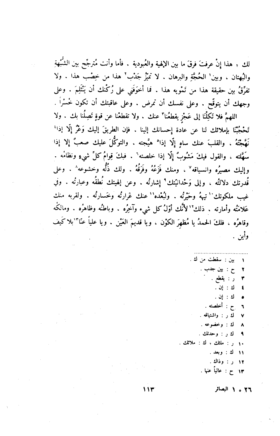 لك؛ هذا إن عرفت فرق ما بين الإلهية والعبودية، فأما وأنت مترجح بين الشبهة والبهتان، وبين الحجة والرهان، لا تميز جدب هذا من خصب هذا، ولا تفرق بين حقيقة هذا من تمويه هذا، فما أخوفني على ركنك أن ينثلم، وعلى وجهك أن يتوقح، وعلى نفسك أن تمرض، وعلى عاقبتك أن تكون خسراً.