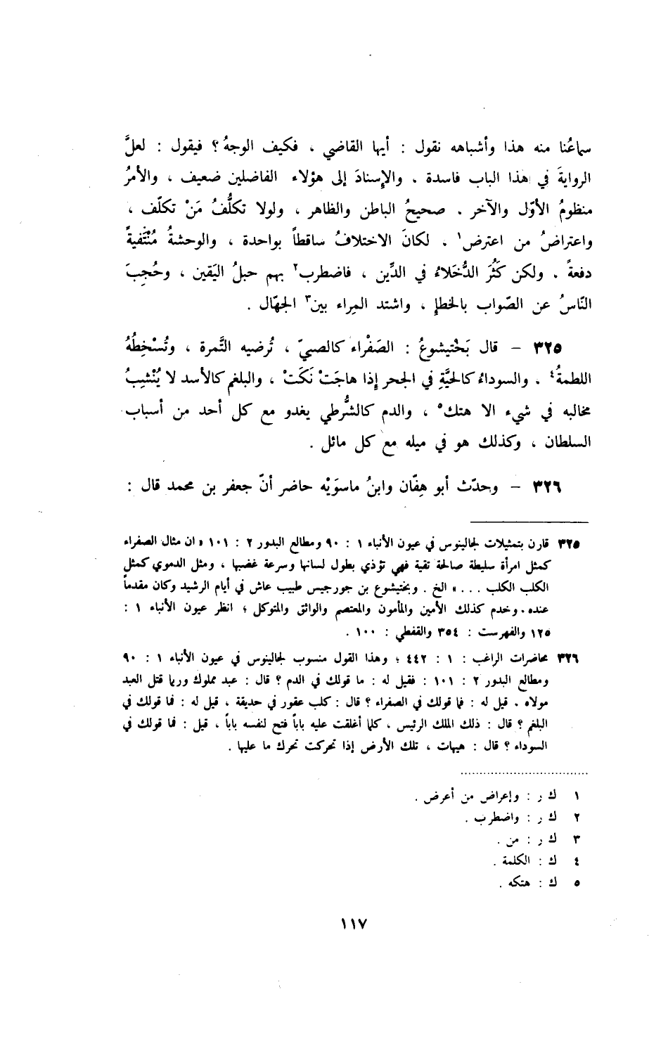قال بختيشوع: الصفراء كالصبي، ترضيه التمرة، وتسخطه اللطمة، والسوداء كالحية في الجحر إذا هاجت نكت، والبلغم كالأسد لا ينشب مخالبه في شيء إلا هتك، والدم كالشرطي يغدو مع كل أحد من أسباب السلطان، وكذلك هو في ميله مع كل مائل.