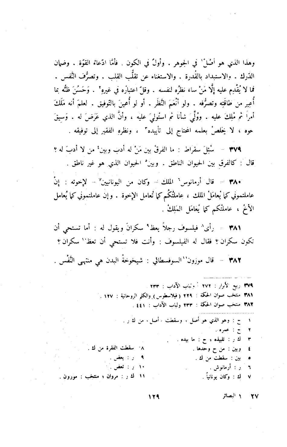 رأى فيلسوف رجلاً يعظ سكران ويقول له: أما تستحي أن تكون سكران؟ فقال له الفيلسوف: وأنت فلا تستحي أن تعظ سكران؟ قال موزون السوفسطائي: شيخوخة البدن هي منتهى النفس.