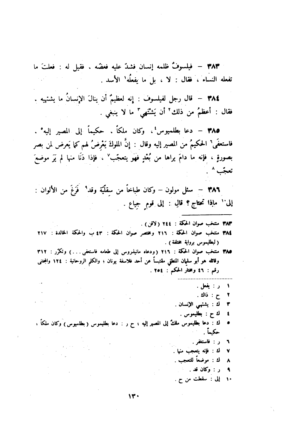 دعا بطلميوس، وكان ملكاً، حكيماً إلى المصير إليه، فأستعفى الحكيم من المصير إليه وقال: إن الملوك يعرض لهم كما يعرض لمن بصر بصورة، فإنه ما دام يراها من بعد فهو يتعجب، فإذا دنا منها لم ير موضع تعجب.