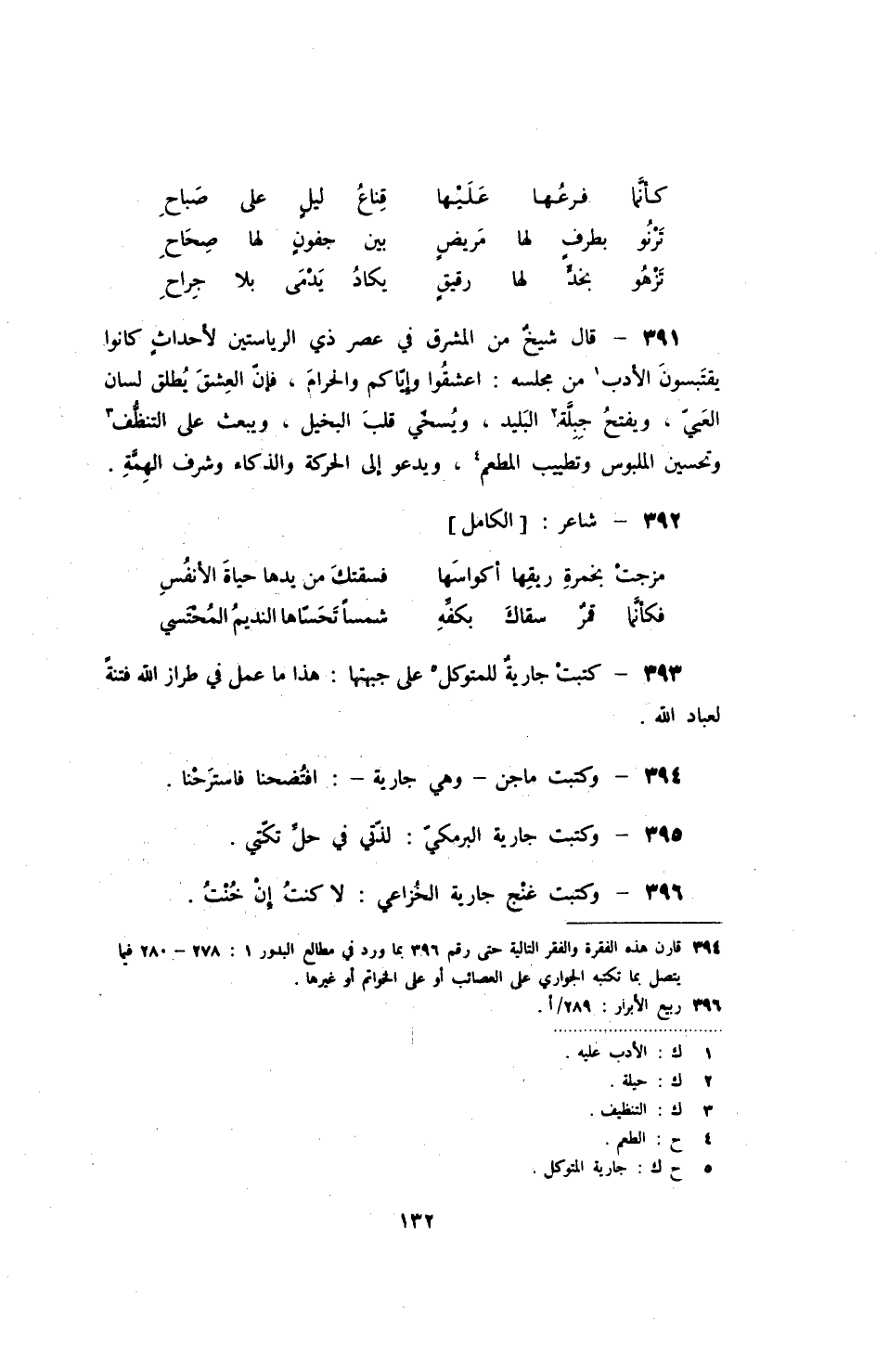 قال شيخ من المشرق في عصر ذي الرياستين لأحداث كانوا يقتبسون الأدب من مجلسه: اعشقوا وإياكم والحرام، فإن العشق يطلق لسان العبي، ويفتح جبلة البليد، ويسخي قلب البخيل، ويبعث على التنظف وتحسين الملبوس وتطييب المطعم، ويدعو إلى الحركة والذكاء وشرف الهمة.