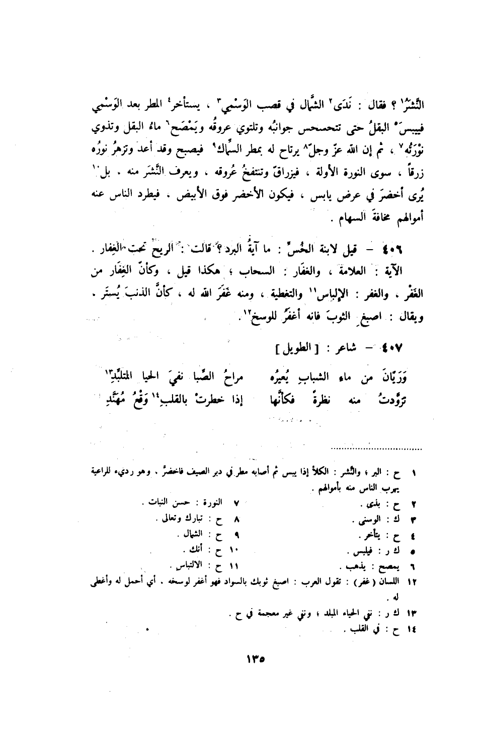 النشر؟ فقال: ندى الشمال في قصب الوسمي، يستأخر المطر بعد الوسمي فييبس البقل حتى تتحسحس جوانبه وتلتوي عروقه ويمصح ماء البقل وتذوي نورته، ثم إن الله عز وجل يرتاح له بمطر السماك فيصبح وقد أعد وتزهو نوره زرقاً، سوى النورة الأولة، فيزراق وتنتفخ عروقه، ويعرف النشر منه، بل يرى أخضر في عرض يابس، فيكون الأخضر فوق الأبيض، فيطرد الناس عنه أموالهم مخافة السهام.