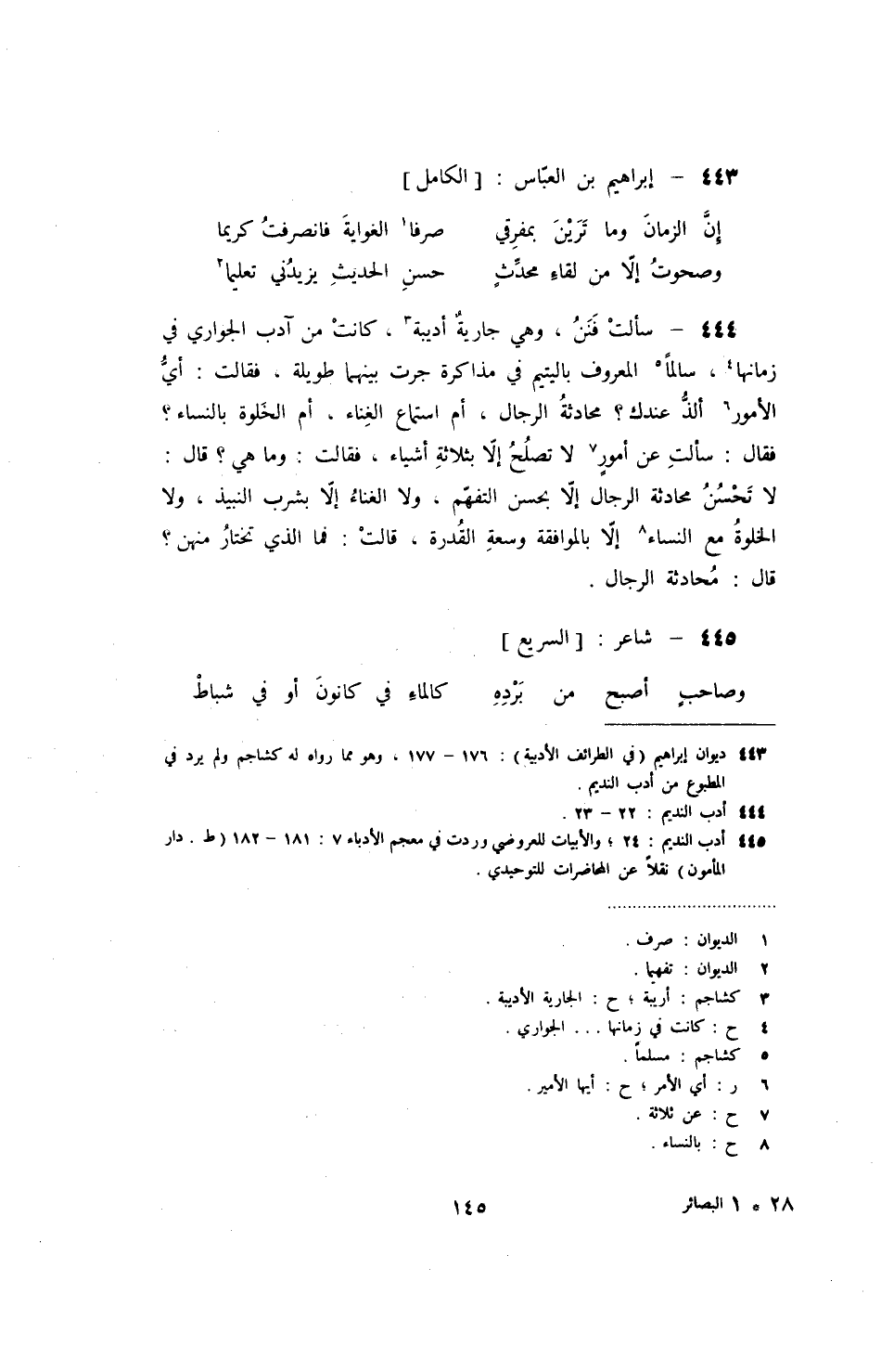 سألت فنن، وهي جارية أديبة، كانت من آدب الجواري في زمانها، سالماً المعروف باليتيم في مذاكرة جرت بينهما طويلة، فقالت: أي الأمور ألذ عندك؟ محادثة الرجال، أم استماع الغناء، ام الخلوة بالنساء؟ فقالت: سألت عن أمور لا تصلح إلا بثلاثة أشياء، فقالت: وما هي؟ قال: لا تحسن محادث الرجال إلا بحسن التفهم، ولا الغناء إلا بشرب النبيذ، ولا الخلوة مع النساء إلا بالموافقة وسعة القدرة، قالت: فما الذي تختار منهن؟ قال: محادثة الرجال.