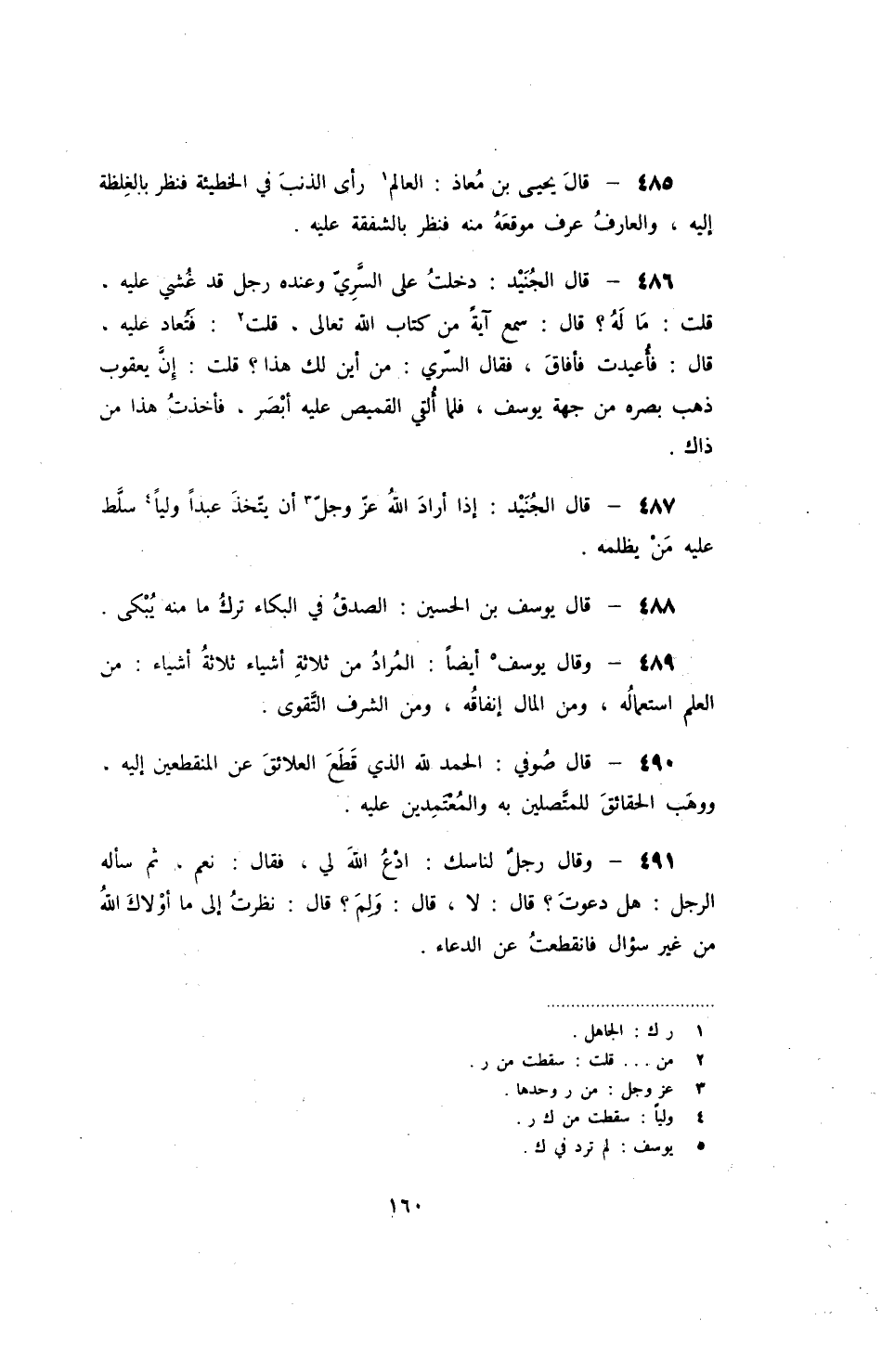قال الجنيد: دخلت على السري وعنده رجل قد غشي عليه، قلت: ما له؟ قال: سمع آية من كتاب الله تعالى، قلت: فتعاد عليه، قال: فأعيدت فأفاق، فقال السري: من أين لك هذا؟ قلت: إن يعقوب ذهب بصره من جهة يوسف، فلما ألقي القميص عليه أبصر، فأخذت هذا من ذاك.