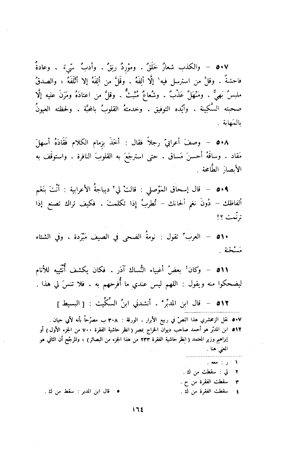 قال إسحاق الموصلي: قالت لي ديباجة الأعرابية: أنت بنغم ألفاظك - دون نغم ألجانك - تطرب إذا تكلمت، فكيف تراك تصنع إذا ترنمت؟! العرب تقول: نومة الضحى في الصيف مبردة، وفي الشتاء مسخنة.