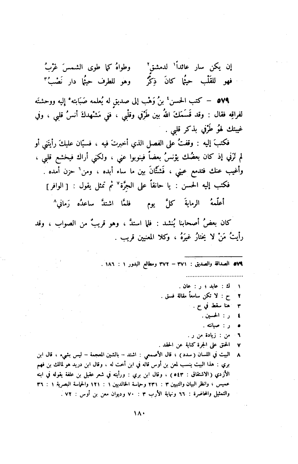 كتب الحسن بن وهب إلى صديق له يعلمه صبابته إليه ووحشته لفراقه فقال: وقد قسمك الله بين طرفي وقلبي، ففي مشهدك أنس قلبي، وفي غيبتك لهو طرفي بذكر قلبي.