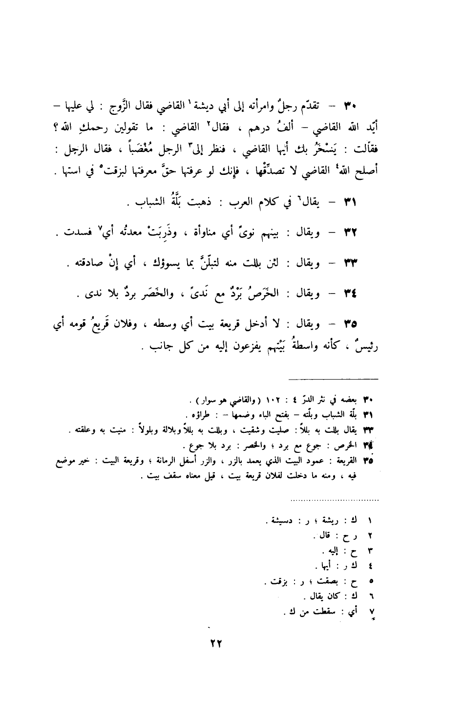 تقدم رجل وامرأته إلى أبي ديشة القاضي فقال الزوج: لي عليها - أيد الله القاضي - ألف درهم، فقال القاضي: ما تقولين رحمك الله؟ فقالت: يسخر بك أيها القاضي، فنظر إلى الرجل مغضباً، فقال الرجل: أصلح الله القاضي لا تصدقها، فإنك لو عرفتها حق معرفتها ابزقت في استها.