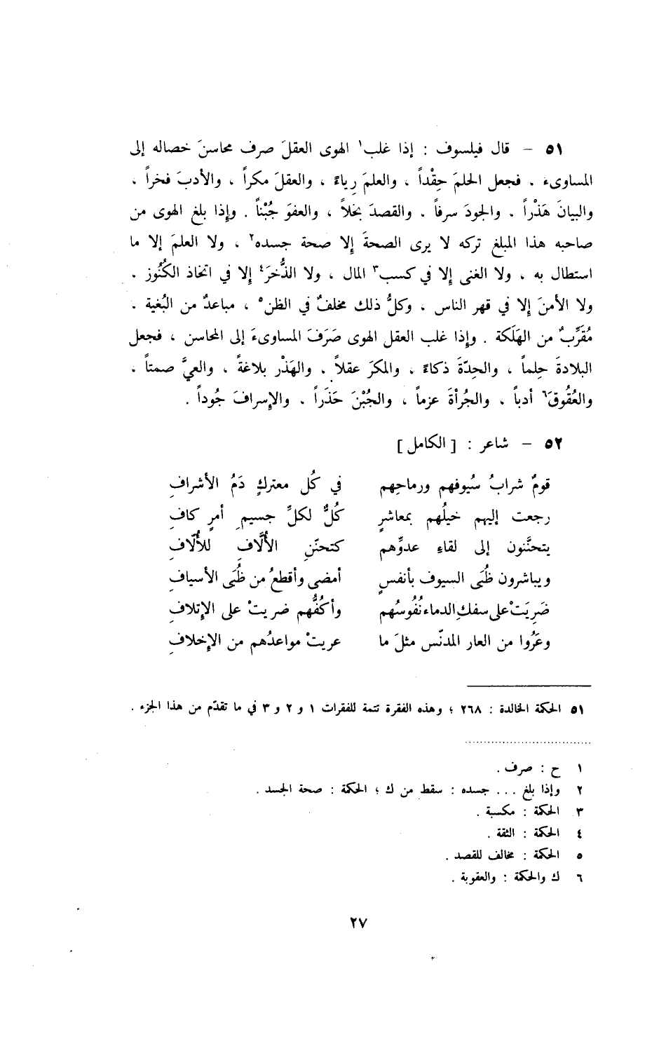 قال فيلسوف: إذا غلب الهوى العقل صرف محاسن خصاله إلى المساؤى، فجعل الحلم حقداً، والعلم رياء، والعقل مكراً، والأدب فخراً، والبيان هذراً، والجود سرفاً، والقصد بخلاً، والعفو جبناً. وإذا بلغ الهوى من صاحبه هذا المبلغ تركه لا يرى الصحة إلا صحة جسده، ولا العلم إلا ما استطال به، ولا الغنى إلا في كسب المال، ولا الذخر إلا في أتخاذ الكنوز، ولا الأمن إلا في قهر الناس، وكل ذلك مخلف في الظن، مباعد من البغية، مقرب من الهلكة. وإذا غلب العقل الهوى صرف المساوىء إلى المحاسن، فجعل البلادة حلماً، والحدة ذكاء، والمكر عقلاً، والهذر بلاغة، والعي صمتاً، والعقوق أدباً، والجرأة عزماً، والجبن حذراً، والإسراف جوداً.