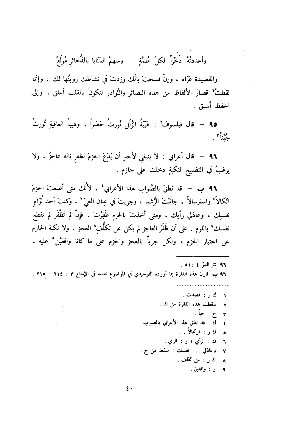 قد نطق بالصواب هذا الأعرابي، لأنك متى أضعت الحزم اتكالاً واسترسالاً، جانبت الرشد، وجريت في عنان الغي، وكنت أحد لوام نفسك، وعاذلي رأيك، ومتى أخذت بالحزم ظفرت، فإن لم تظفر لم تقطع نفسك باللوم. على أن ظفر العاجز لم يكن عن تكلف العجز، ولا نكبة الحازم عن اختيار الحزم، ولكن جرياً بالعجز والحزم على ما كانا واقعين عليه،