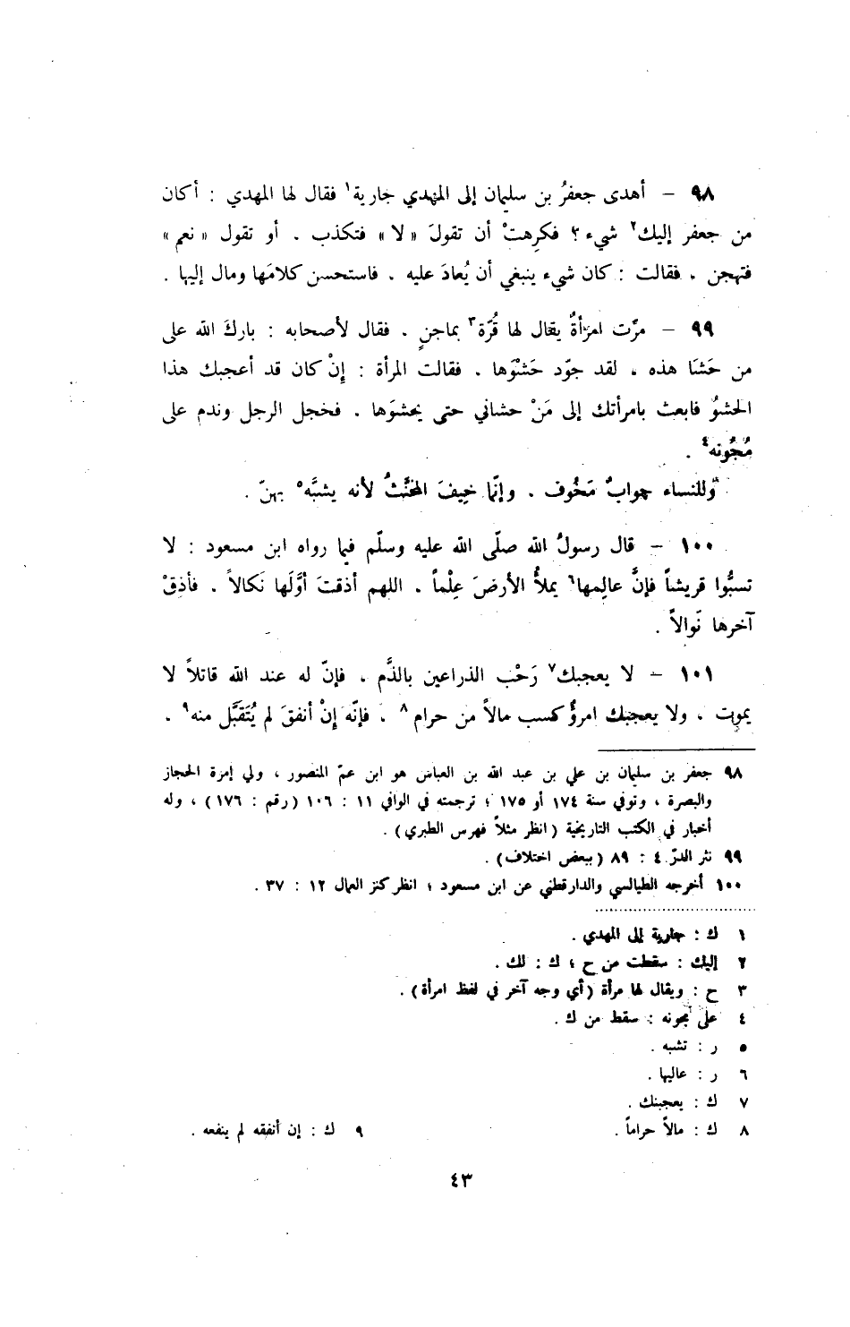 أهدى جعفر بن سليمان إلى المهدي جارية فقال لها المهدي: أكان من جعفر إليك شيء؟ فكرهت أن تقول لا فتكذب، أو تقول نعم فتهجن، فقالت: كان شيء ينبغي أن يعاد عليه، فأستحسن كلامها ومال إليها.