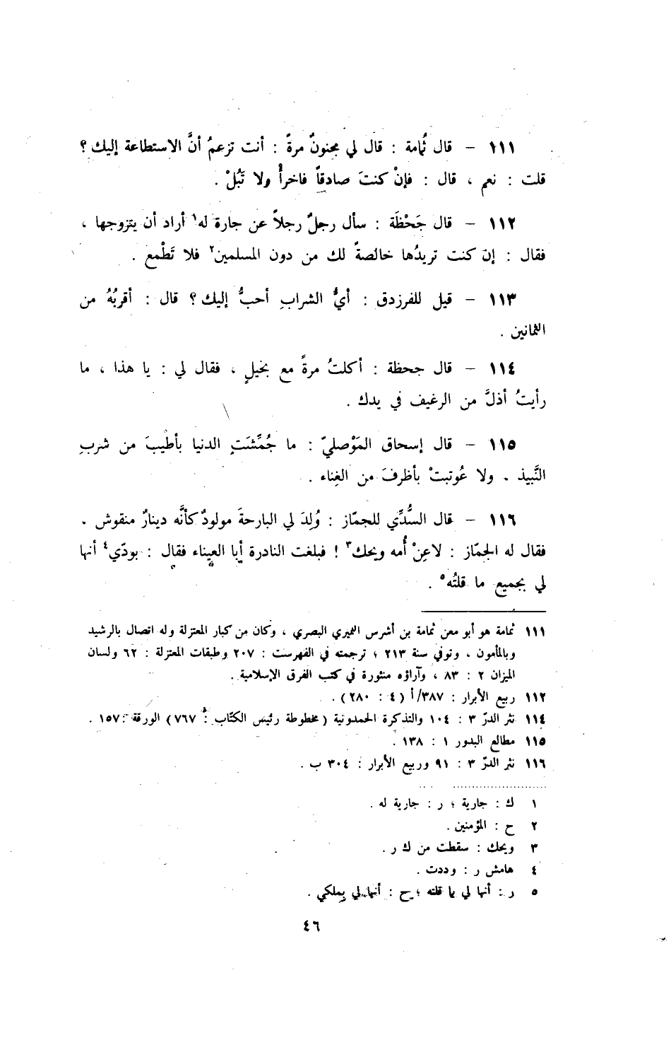 قال ثمامة: قال لي مجنون مرة: أنت تزعم أن الأستطاعة إليك؟ قلت: نعم، قال: فإن كنت صادقاً فاخرأ ولا تبل.
