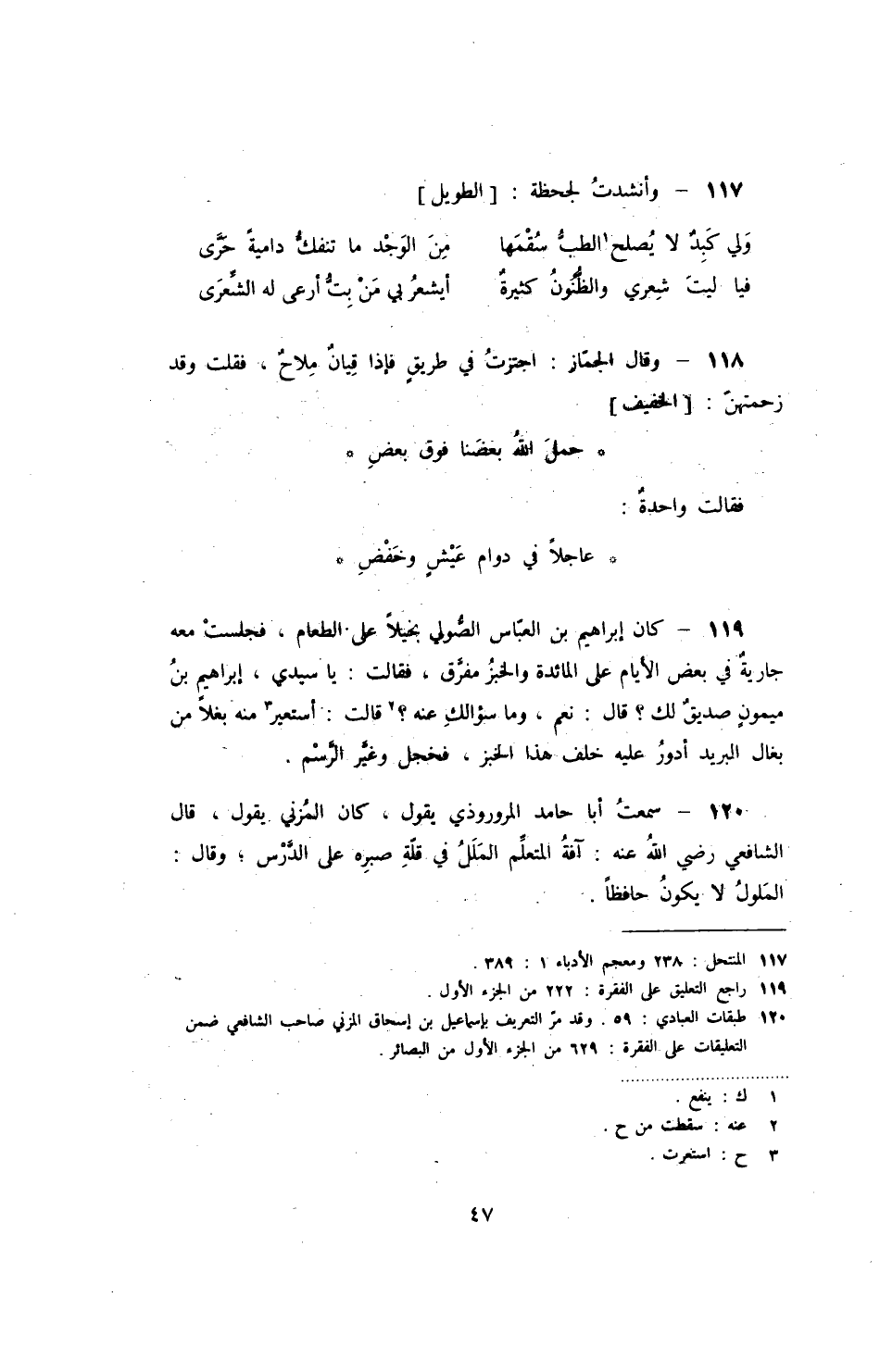سمعت أبا حامد المروروذي يقول، كان المزني يقول، قال الشافعي رضي الله عنه: آفة المتعلم الملل في قلة صبره على الدرس؛ وقال: الملول لا يكون حافظاً.